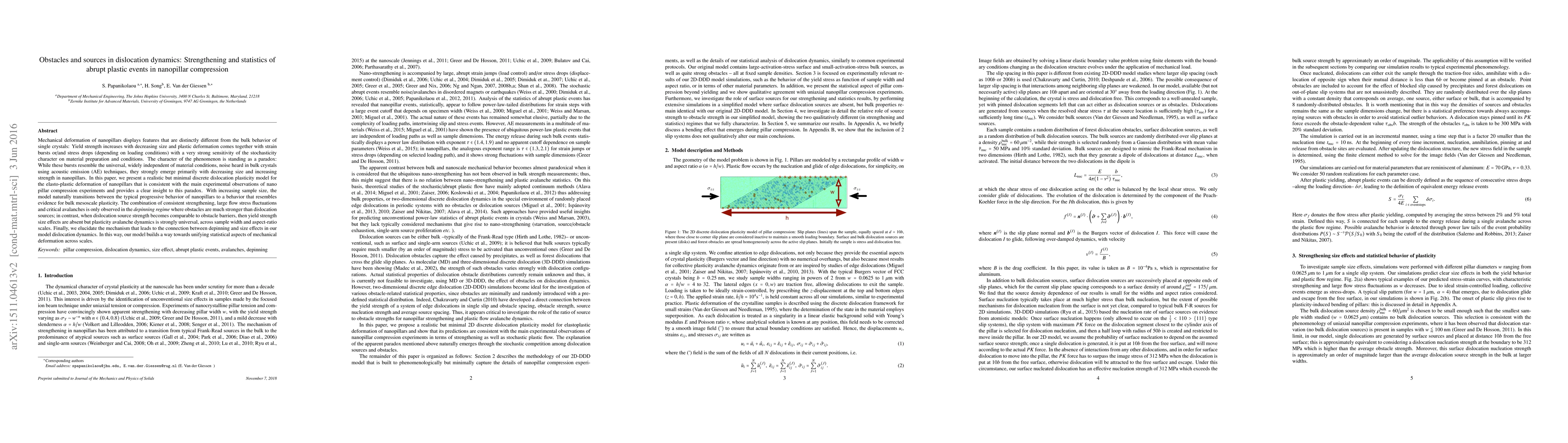 This paper presents a discrete dislocation plasticity model explaining the paradoxical behavior of nanopillars under compression, where yield strength increases with size reduction and plastic deformation manifests as abrupt strain bursts. The model reveals that size effects and strengthening are prominent in the depinning regime, while universal plasticity avalanche dynamics emerge when dislocation source strength is comparable to obstacle barriers.