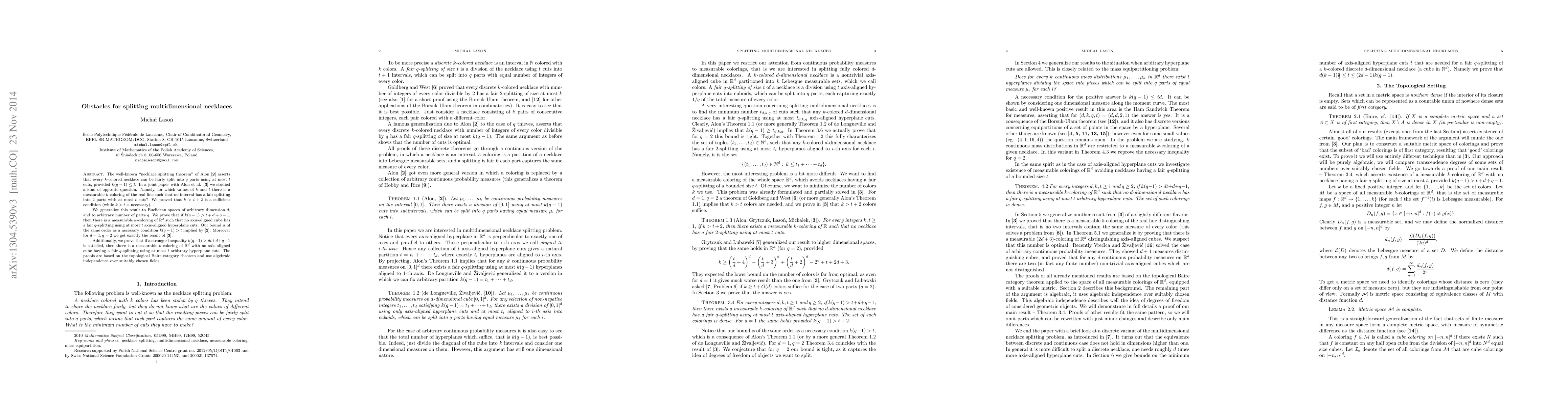 This paper extends the necklace splitting theorem to higher dimensions, proving that for k > t + d + q - 1, there's a measurable k-coloring of R^d with no axis-aligned cube having a fair q-splitting using at most t hyperplane cuts. The proofs leverage the topological Baire category theorem and algebraic independence over chosen fields.