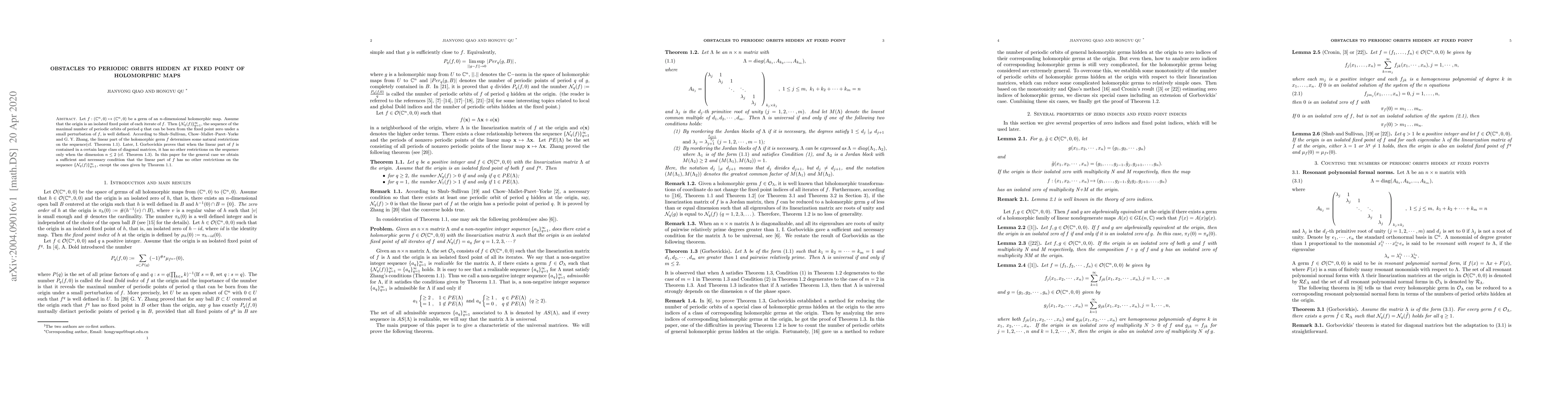 This paper investigates the periodic orbits of holomorphic maps near fixed points, establishing a sufficient and necessary condition for the linear part of the map to impose no additional restrictions on the sequence of maximal periodic orbits beyond those already determined by existing theorems. The study focuses on the general case beyond dimension two, where previous results were limited.