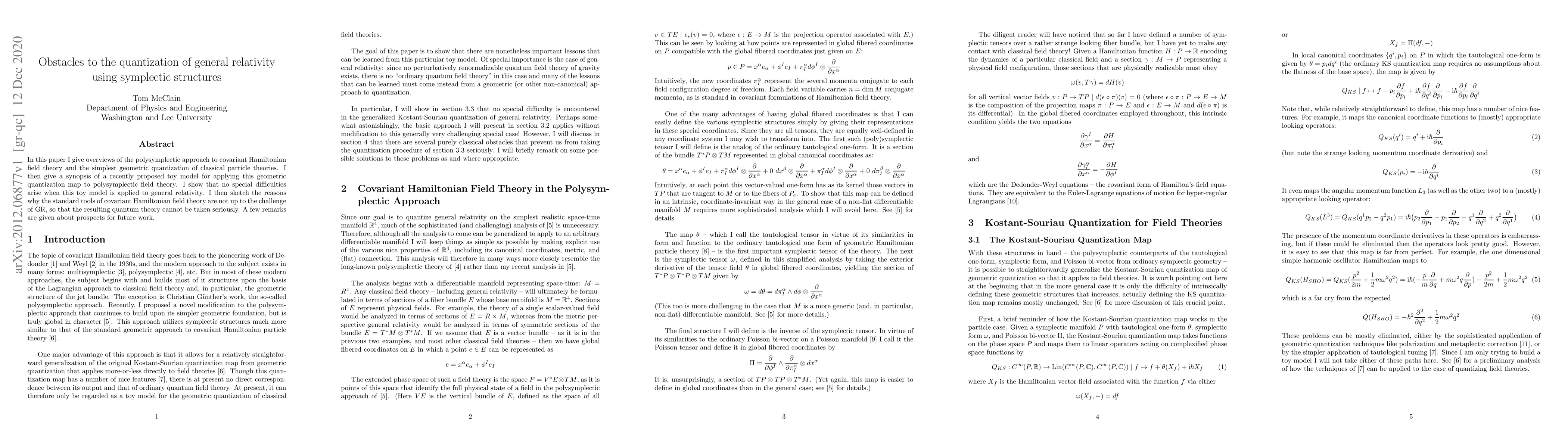 In this paper I give overviews of the polysymplectic approach to covariant Hamiltonian field theory and the simplest geometric quantization of classical particle theories. I then give a synopsis of a recently proposed toy model for applying this geometric quantization map to polysymplectic field theory. I show that no special difficulties arise when this toy model is applied to general relativity. I then sketch the reasons why the standard tools of covariant Hamiltonian field theory are not up to the challenge of GR, so that the resulting quantum theory cannot be taken seriously. A few remarks are given about prospects for future work.