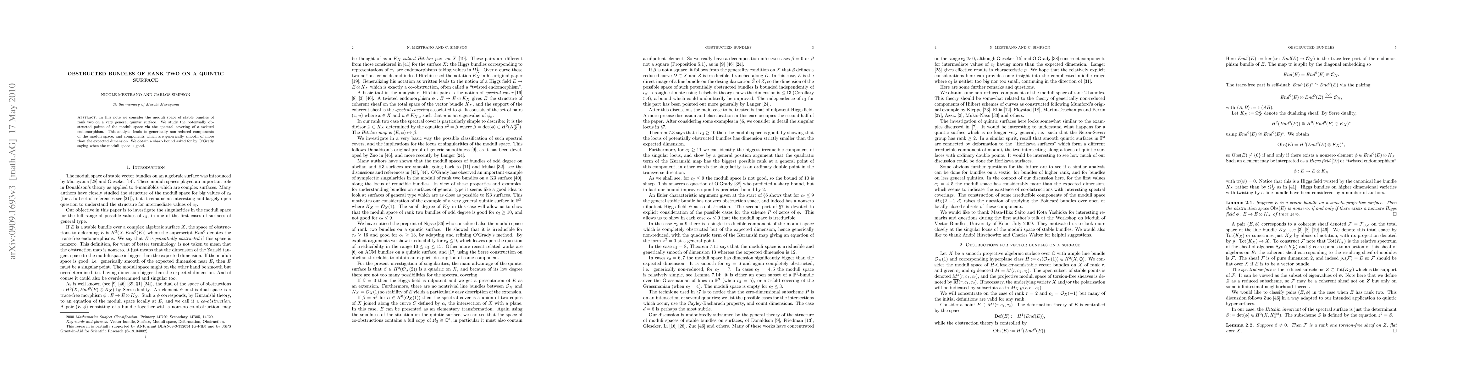 This paper investigates the moduli space of rank two stable bundles on a quintic surface, revealing obstructed points via spectral coverings and identifying components that are generically non-reduced and exceed expected dimensions. The study establishes a precise condition for the moduli space to be "good," as requested by O'Grady.