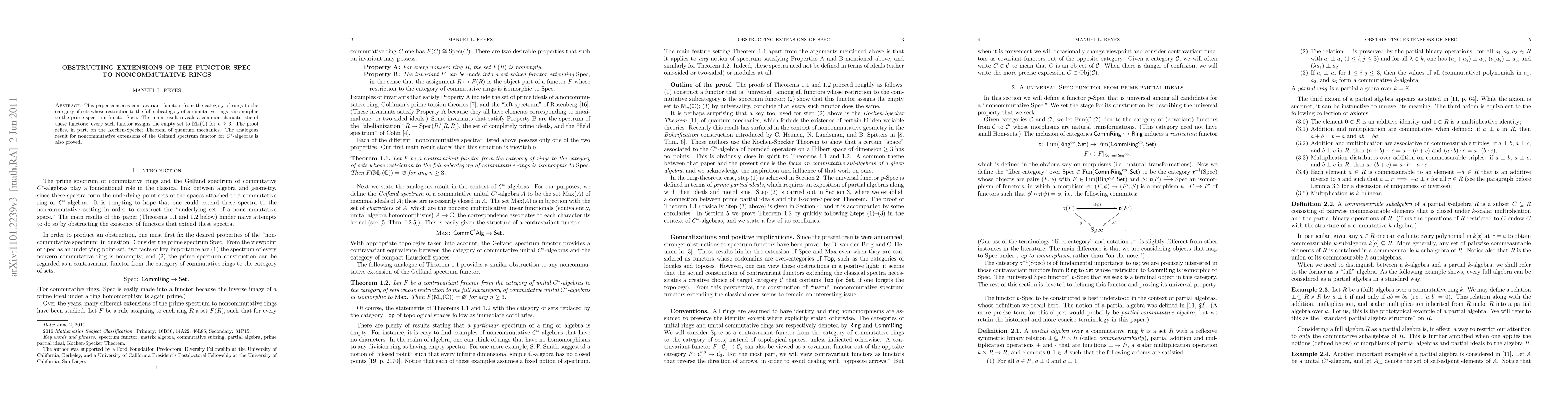 In this paper we study contravariant functors from the category of rings to the category of sets whose restriction to the full subcategory of commutative rings is isomorphic to the prime spectrum functor Spec. The main result reveals a common characteristic of these functors: every such functor assigns the empty set to M_n(C) for n >= 3. The proof relies, in part, on the Kochen-Specker Theorem of quantum mechanics. The analogous result for noncommutative extensions of the Gelfand spectrum functor for C*-algebras is also proved.
