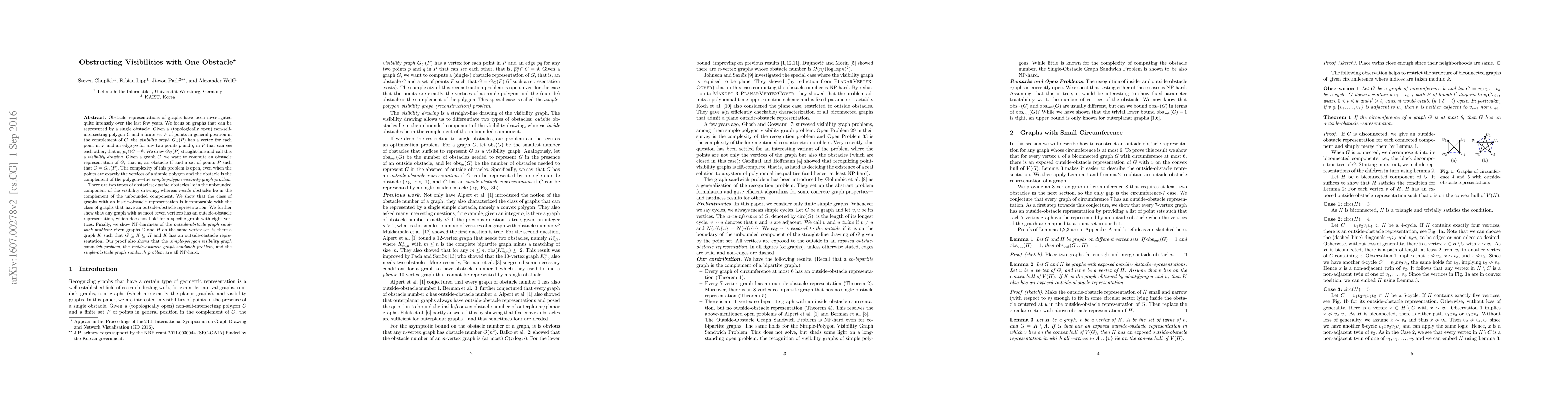 Obstacle representations of graphs have been investigated quite intensely over the last few years. We focus on graphs that can be represented by a single obstacle. Given a (topologically open) polygon $C$ and a finite set $P$ of points in general position in the complement of $C$, the visibility graph $G_C(P)$ has a vertex for each point in $P$ and an edge $pq$ for any two points $p$ and $q$ in $P$ that can see each other, that is, $\overline{pq} \cap C=\emptyset$. We draw $G_C(P)$ straight-line. Given a graph $G$, we want to compute an obstacle representation of $G$, that is, an obstacle $C$ and a set of points $P$ such that $G=G_C(P)$. The complexity of this problem is open, even for the case that the points are exactly the vertices of a simple polygon and the obstacle is the complement of the polygon-the simple-polygon visibility graph problem. There are two types of obstacles; an inside obstacle lies in a bounded component of the complement of the visibility drawing, whereas an outside obstacle lies in the unbounded component. We show that the class of graphs with an inside-obstacle representation is incomparable with the class of graphs that have an outside-obstacle representation. We further show that any graph with at most seven vertices or circumference at most 6 has an outside-obstacle representation, which does not hold for a specific graph with 8 vertices and circumference 8. Finally, we consider the outside-obstacle graph sandwich problem: given graphs $G$ and $H$ on the same vertex set, is there a graph $K$ such that $G \subseteq K \subseteq H$ and $K$ has an outside-obstacle representation? We show that this problem is NP-hard even for co-bipartite graphs. With slight modifications, our proof also shows that the inside-obstacle graph sandwich problem, the single-obstacle graph sandwich problem, and the simple-polygon visibility graph sandwich problem are all NP-hard.
