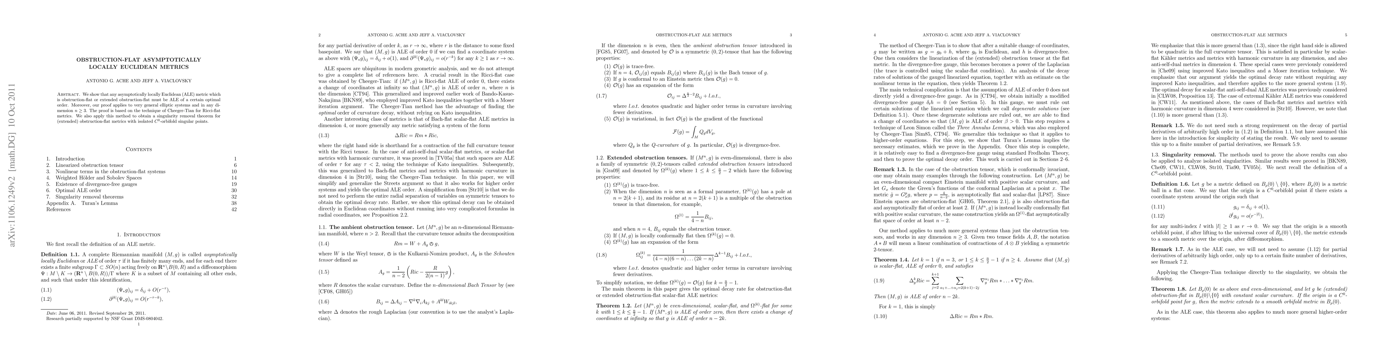 We show that any asymptotically locally Euclidean (ALE) metric which is obstruction-flat or extended obstruction-flat must be ALE of a certain optimal order. Moreover, our proof applies to very general elliptic systems and in any dimension $n \geq 3$. The proof is based on the technique of Cheeger-Tian for Ricci-flat metrics. We also apply this method to obtain a singularity removal theorem for (extended) obstruction-flat metrics with isolated $C^0$-orbifold singular points.