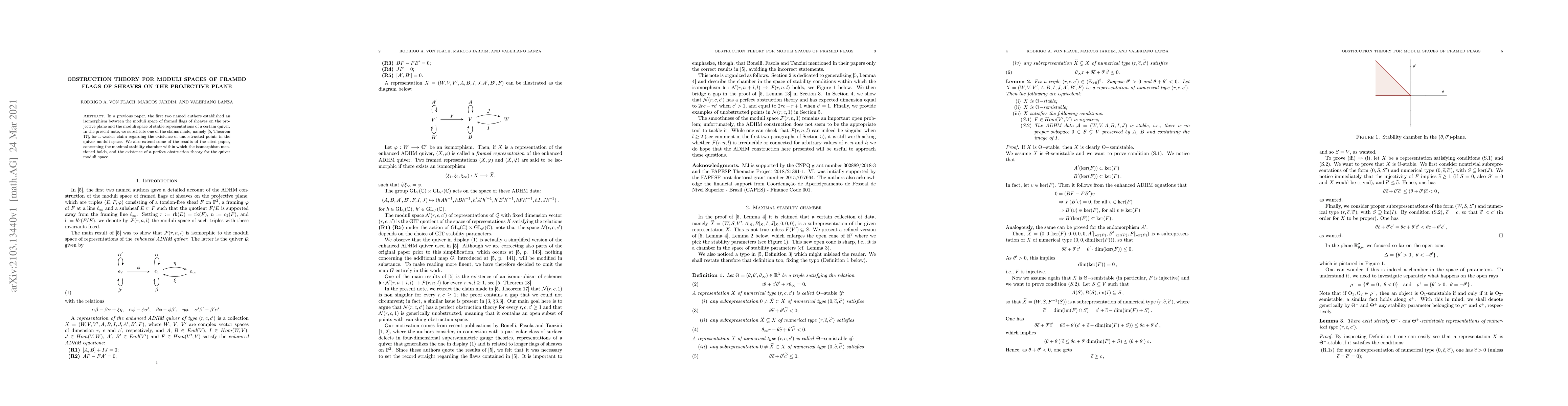 In a previous paper, the first two named authors established an isomorphism between the moduli space of framed flags of sheaves on the projective plane and the moduli space of stable representations of a certain quiver. In the present note, we substitute one of the claims made, namely [5, Theorem 17], for a weaker claim regarding the existence of unobstructed points in the quiver moduli space. We also extend some of the results of the cited paper, concerning the maximal stability chamber within which the isomorphism mentioned holds, and the existence of a perfect obstruction theory for the quiver moduli space.
