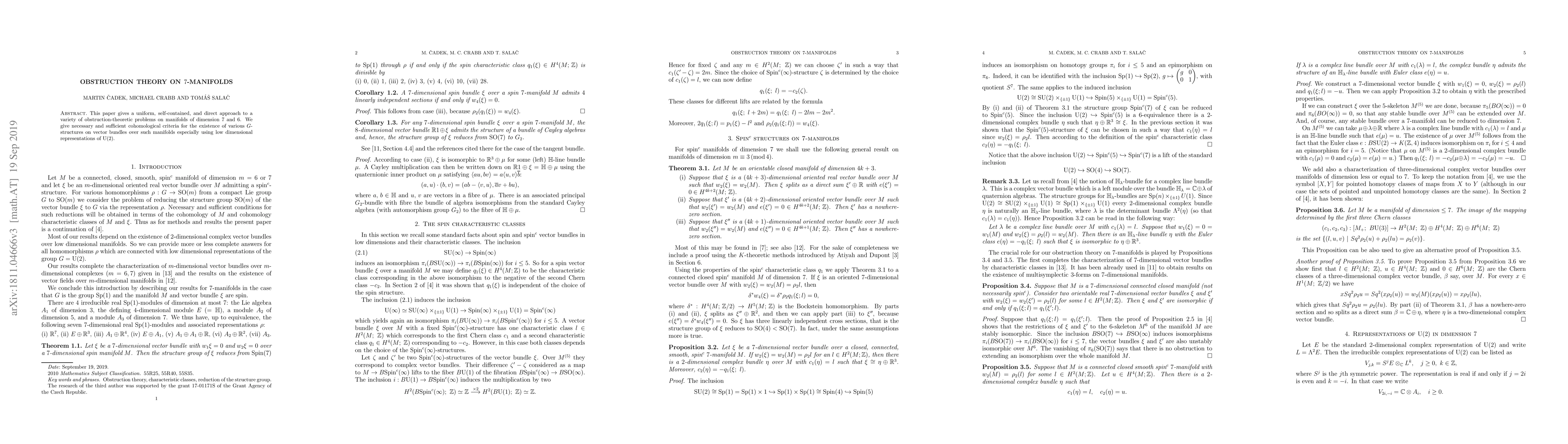 This paper presents a direct approach to obstruction-theoretic problems on 7-manifolds and 6-manifolds, providing necessary and sufficient cohomological criteria for the existence of G-structures on vector bundles, with a focus on low-dimensional representations of U(2).