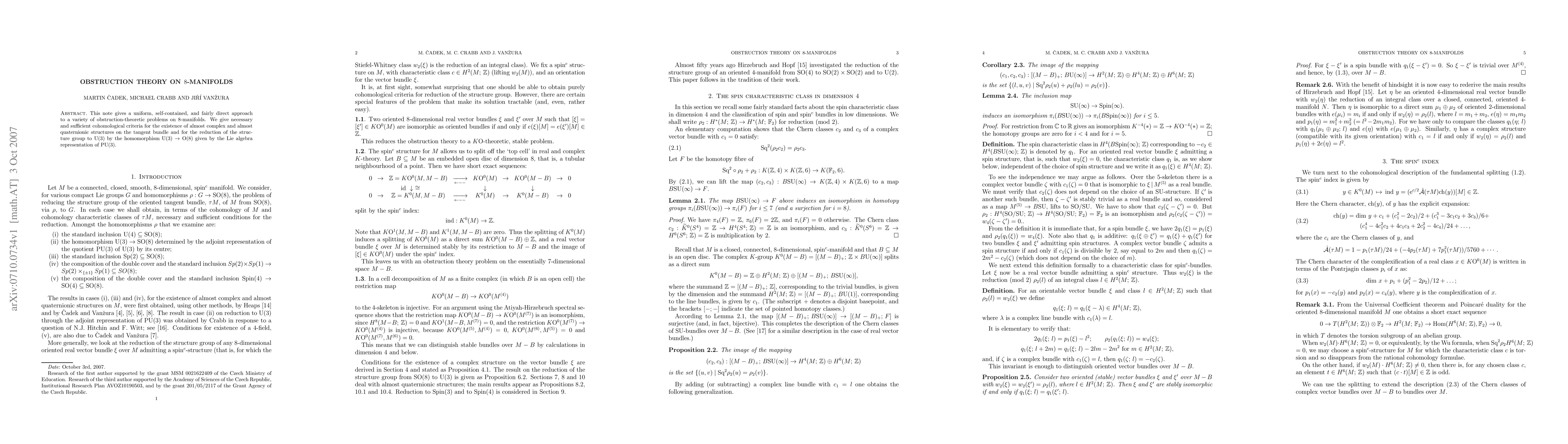Summary: This paper presents a straightforward method for addressing various obstruction problems on 8-manifolds, providing necessary and sufficient cohomological criteria for the existence of almost complex and almost quaternionic structures, as well as the reduction of the structure group to U(3).