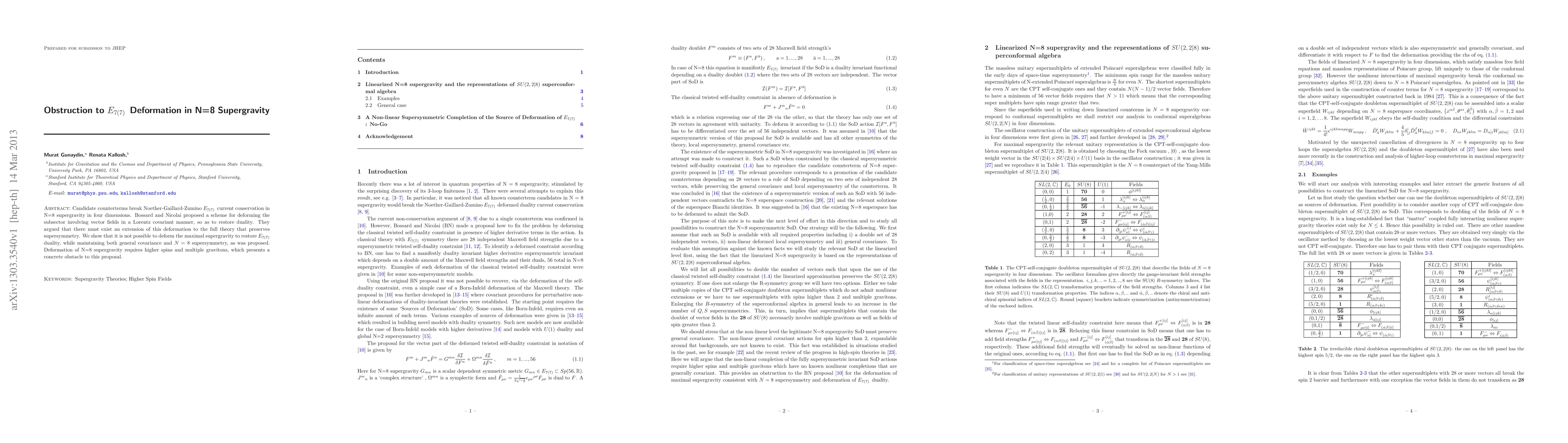 The paper analyzes the possibility of deforming N=8 supergravity to restore E_{7(7)} duality while preserving general covariance and N=8 supersymmetry, using linearized N=8 supergravity and representations of SU(2,2|8) superconformal algebra.