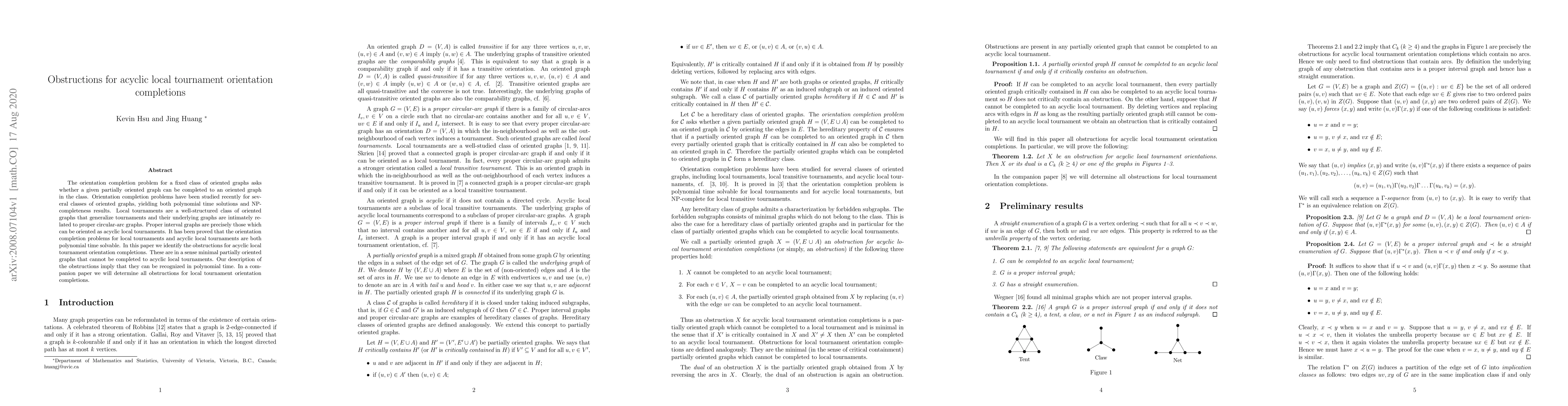 This paper identifies minimal partially oriented graphs, known as obstructions, that cannot be completed to acyclic local tournament orientation completions. The authors demonstrate that these obstructions can be recognized in polynomial time, contributing to the understanding of the complexity of orientation completion problems for acyclic local tournaments.