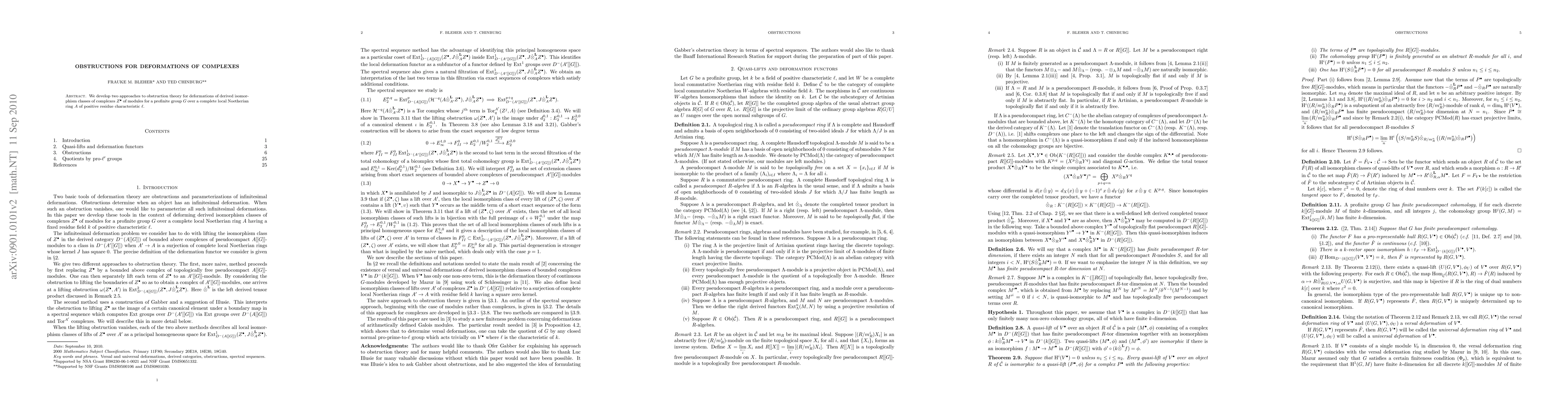 The paper develops two approaches to obstruction theory for deformations of derived isomorphism classes of complexes of modules for a profinite group G over a complete local Noetherian ring A of positive residue characteristic \ell.