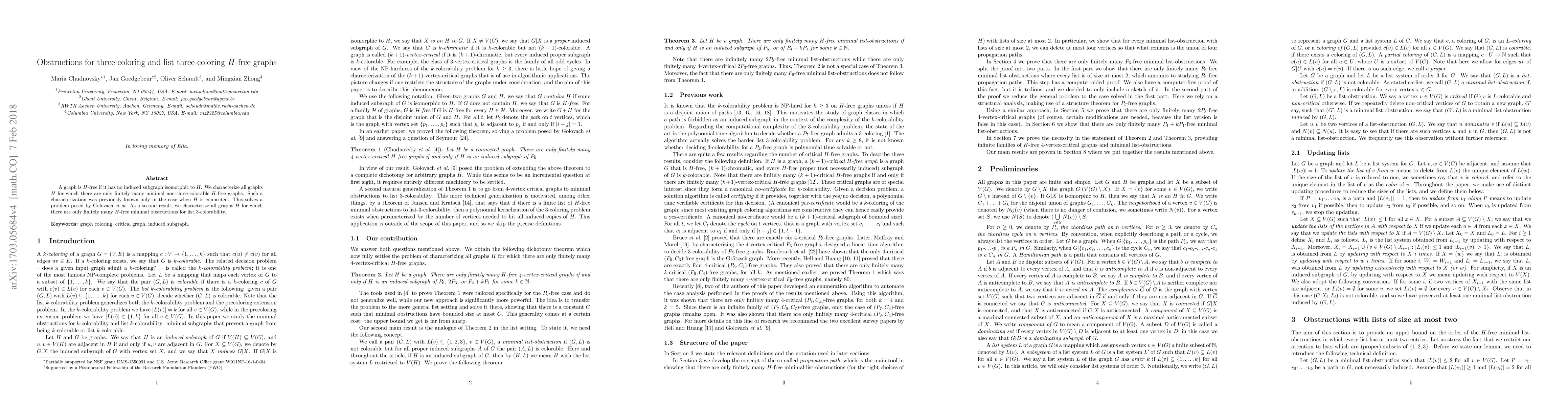 This paper characterizes H-free graphs with only finitely many minimal non-three-colorable subgraphs and lists colorable obstructions for list 3-colorability, solving a problem posed by Golovach et al.