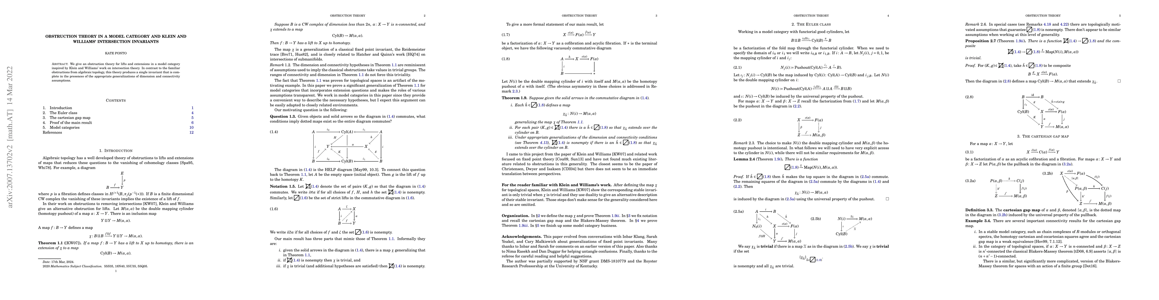 This paper introduces a new approach to studying obstructions in model categories, inspired by Klein and Williams' work on intersection theory, resulting in a single invariant for lifts and extensions.
