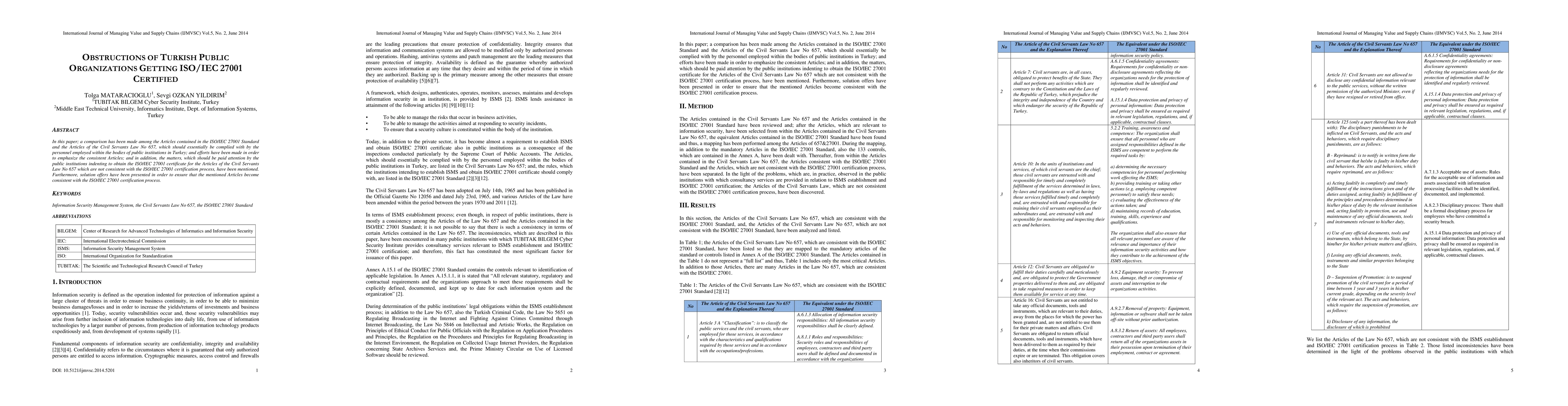 In this paper; a comparison has been made among the Articles contained in the ISO/IEC 27001 Standard and the Articles of the Civil Servants Law No 657, which should essentially be complied with by the personnel employed within the bodies of public institutions in Turkey; and efforts have been made in order to emphasize the consistent Articles; and in addition, the matters, which should be paid attention by the public institutions indenting to obtain the ISO/IEC 27001 certificate for the Articles of the Civil Servants Law No 657 which are not consistent with the ISO/IEC 27001 certification process, have been mentioned. Furthermore, solution offers have been presented in order to ensure that the mentioned Articles become consistent with the ISO/IEC 27001 certification process.