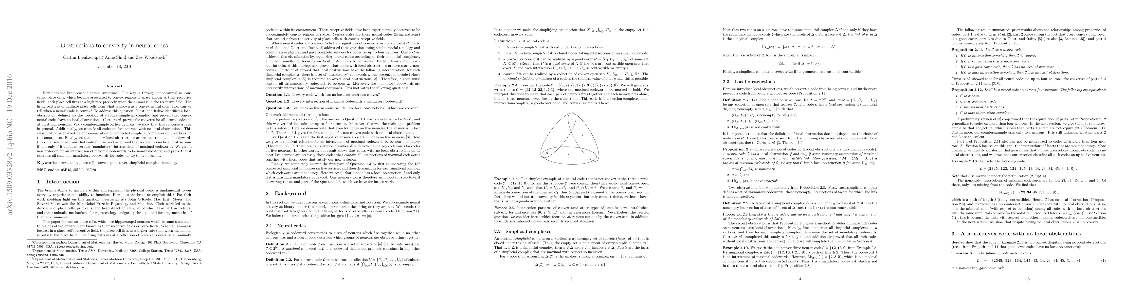 This paper investigates the conditions under which neural codes formed by hippocampal place cells are convex, identifying local obstructions via simplicial complex topology. The authors demonstrate that while convex neural codes lack local obstructions, the converse does not hold in general, as shown by a counterexample on five neurons. They classify all codes on five neurons without local obstructions and provide a new criterion for non-mandatory intersections of maximal codewords.