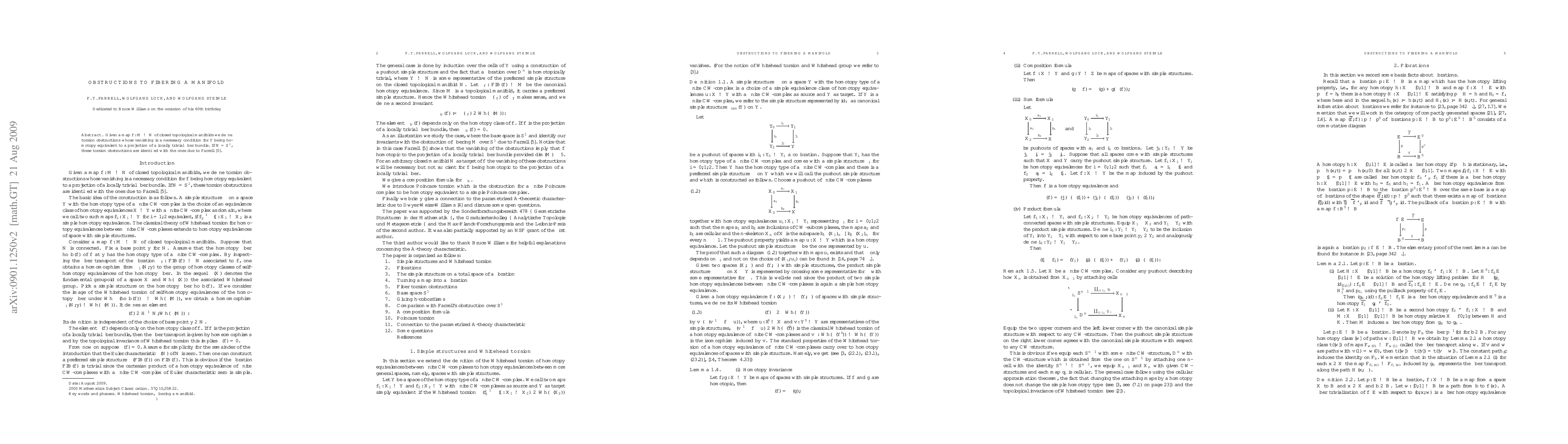 Given a map f: M \to M of closed topological manifolds we define torsion obstructions whose vanishing is a necessary condition for f being homotopy equivalent to a projection of a locally trivial fiber bundle. If N = S^1, these torsion obstructions are identified with the ones due to Farrell. We have changed the exposition according to the comments of the referee and corrected some typos. The paper will appear in Geometriae Dedicata.