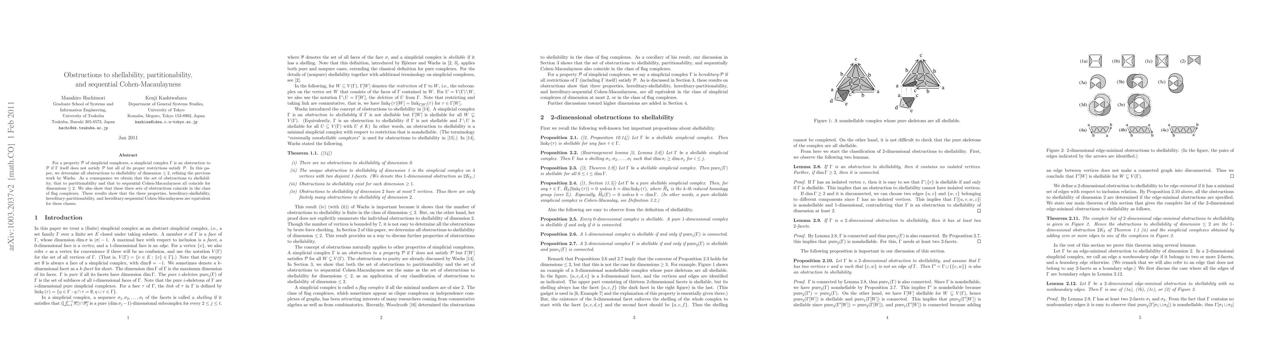 This paper identifies all dimension $\le 2$ obstructions to shellability, showing they coincide with obstructions to partitionability and sequential Cohen-Macaulayness. It concludes that these properties are equivalent for dimension $\le 2$ and for flag complexes.
