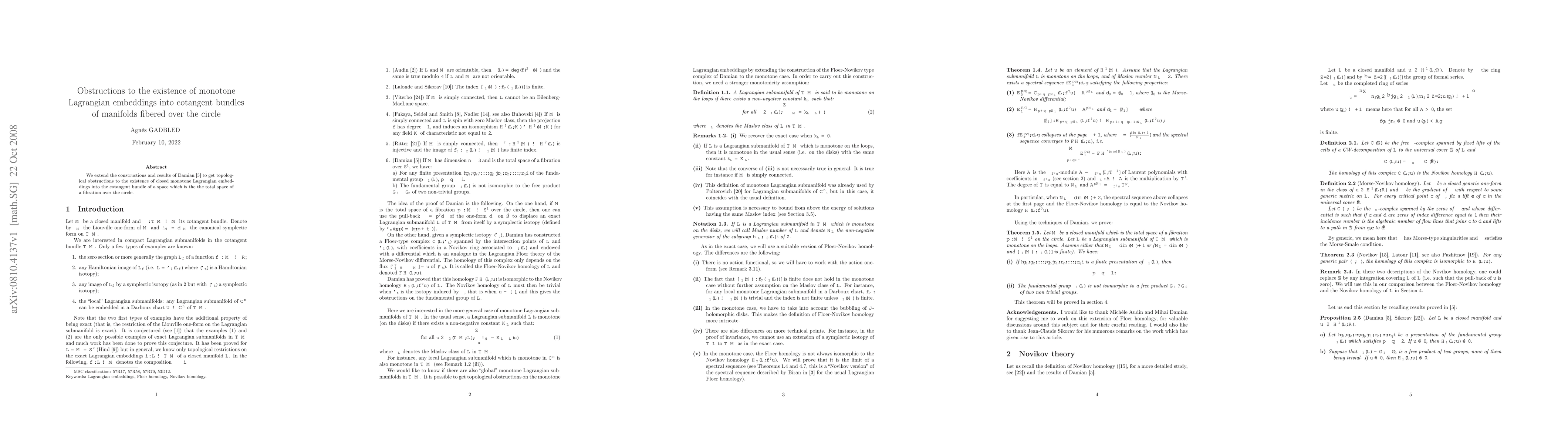 We extend constructions and results of Damian to get topological obstructions to the existence of closed monotone Lagrangian embeddings into the cotangent bundle of a space which is the total space of a fibration over the circle.