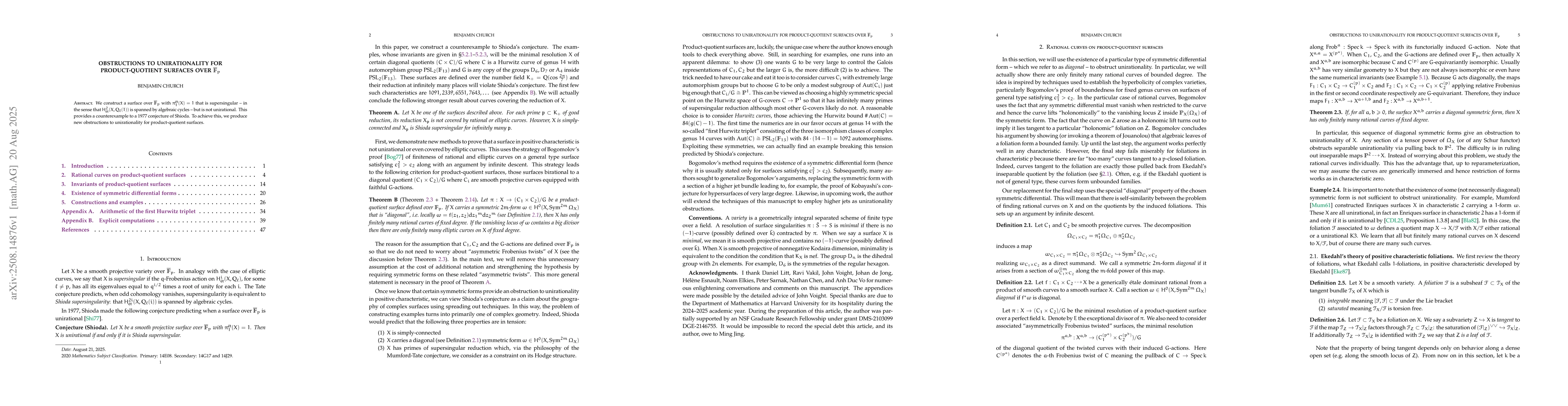 The paper presents a counterexample to a 1977 Shioda conjecture by constructing a surface over $overline{mathbb{F}}_p$ with specific properties. This surface, which is supersingular and has $pi_1^{'{e}t}(X) = 1$, is not unirational, demonstrating new obstructions to unirationality for product-quotient surfaces.