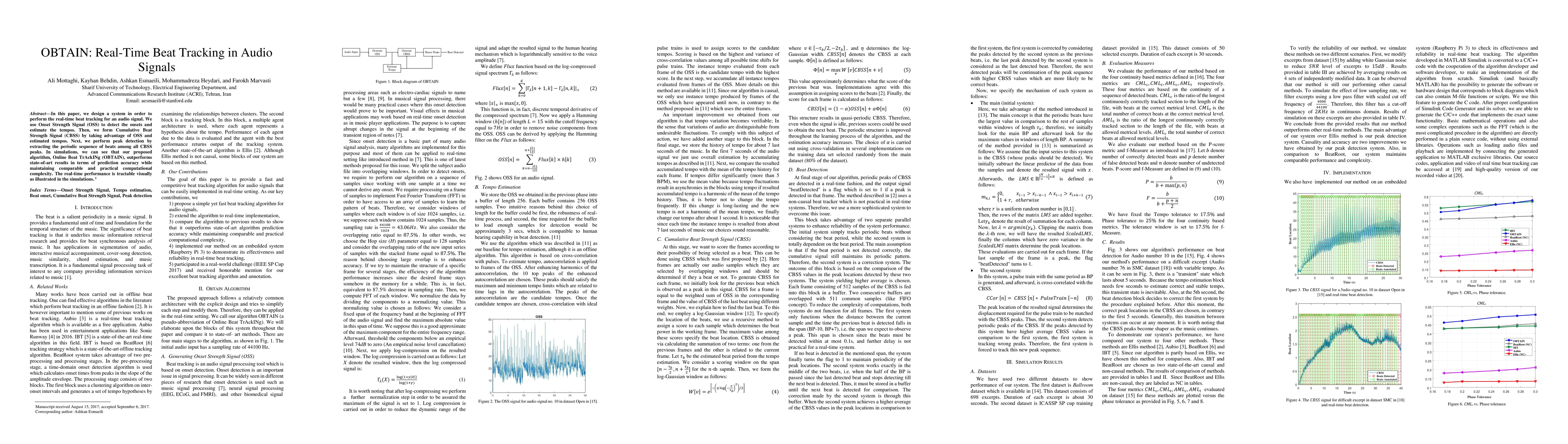 The paper presents a system called OBTAIN for real-time beat tracking in audio signals, utilizing Onset Strength Signal (OSS) and Cumulative Beat Strength Signal (CBSS) to detect beats and estimate tempos. The proposed algorithm outperforms existing methods in accuracy while maintaining practical computational complexity.
