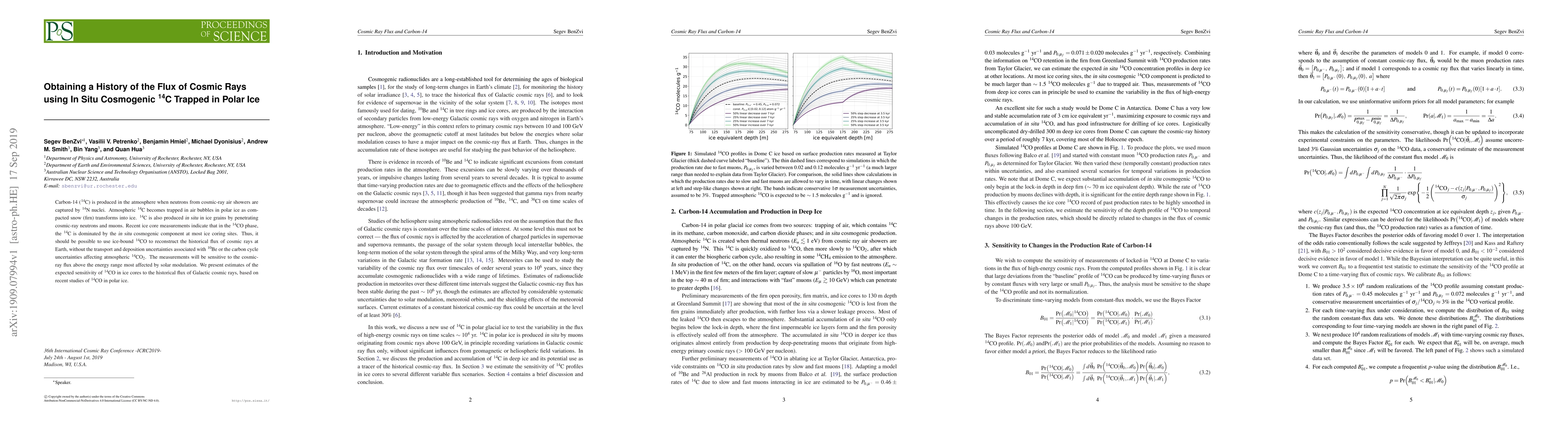 Carbon-14 ($^{14}$C) is produced in the atmosphere when neutrons from cosmic-ray air showers are captured by $^{14}$N nuclei. Atmospheric $^{14}$C becomes trapped in air bubbles in polar ice as compacted snow (firn) transforms into ice. $^{14}$C is also produced in situ in ice grains by penetrating cosmic-ray neutrons and muons. Recent ice core measurements indicate that in the $^{14}$CO phase, the $^{14}$C is dominated by the in situ cosmogenic component at most ice coring sites. Thus, it should be possible to use ice-bound $^{14}$CO to reconstruct the historical flux of cosmic rays at Earth, without the transport and deposition uncertainties associated with $^{10}$Be or the carbon cycle uncertainties affecting atmospheric $^{14}$CO$_2$. The measurements will be sensitive to the cosmic-ray flux above the energy range most affected by solar modulation. We present estimates of the expected sensitivity of $^{14}$CO in ice cores to the historical flux of Galactic cosmic rays, based on recent studies of $^{14}$CO in polar ice.