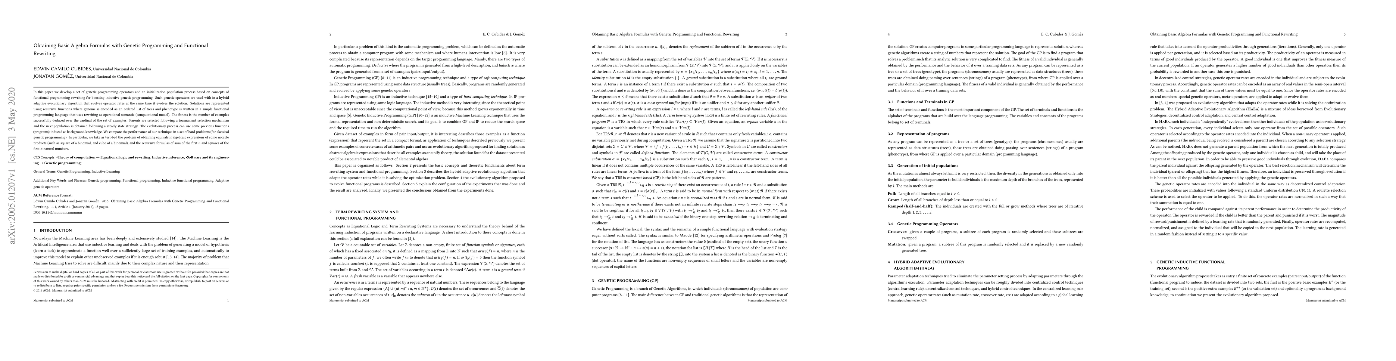 This paper proposes a hybrid adaptive evolutionary algorithm using genetic programming and functional rewriting to derive basic algebra formulas. The method employs genetic operators and an initialization process based on functional programming, evolving both operator rates and solutions represented as recursive functions.