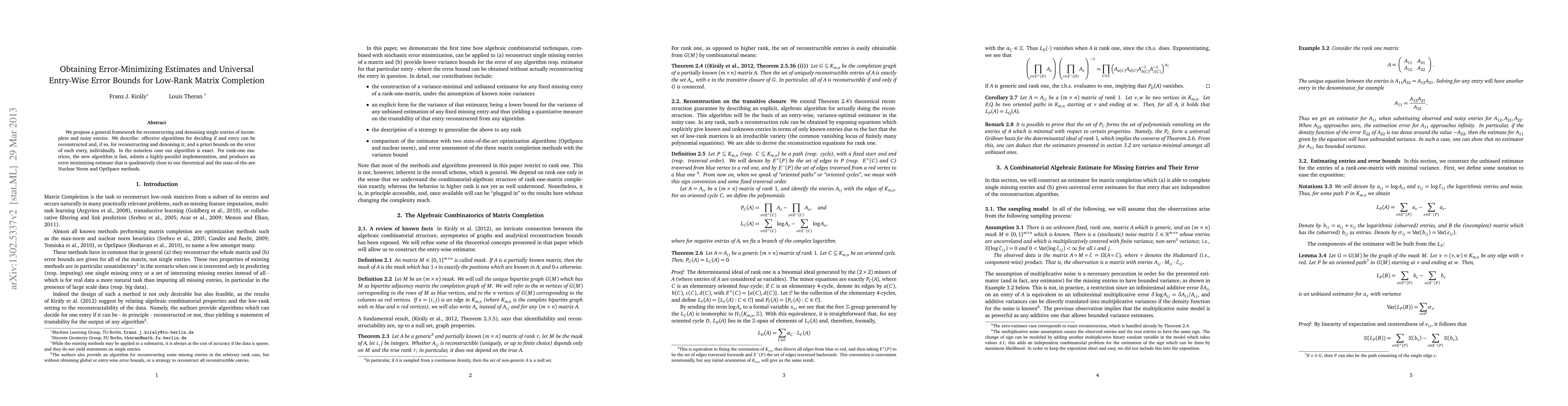 We propose a general framework for reconstructing and denoising single entries of incomplete and noisy entries. We describe: effective algorithms for deciding if and entry can be reconstructed and, if so, for reconstructing and denoising it; and a priori bounds on the error of each entry, individually. In the noiseless case our algorithm is exact. For rank-one matrices, the new algorithm is fast, admits a highly-parallel implementation, and produces an error minimizing estimate that is qualitatively close to our theoretical and the state-of-the-are Nuclear Norm and OptSpace methods.