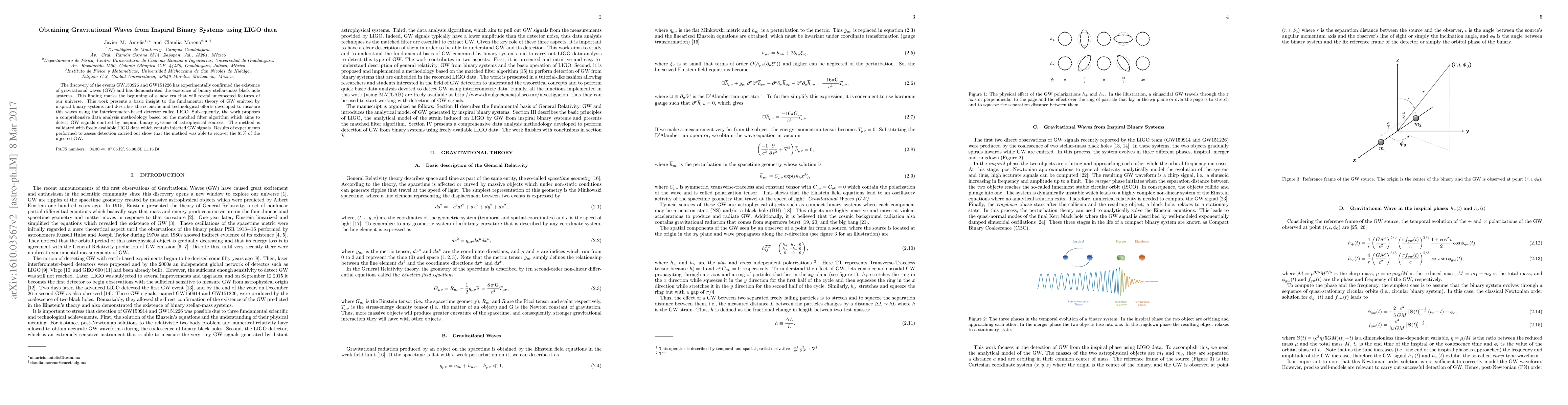 The discovery of the astrophysical events GW150926 and GW151226 has experimentally confirmed the existence of gravitational waves (GW) and has demonstrated the existence of binary stellar-mass black hole systems. This finding marks the beginning of a new era that will reveal unexpected features of our universe. This work presents a basic insight to the fundamental theory of GW emitted by inspiral binary systems and describes the scientific and technological efforts developed to measure these waves using the interferometer-based detector called LIGO. Subsequently, the work presents a comprehensive data analysis methodology based on the matched filter algorithm, which aims to recovery GW signals emitted by inspiral binary systems of astrophysical sources. This algorithm was evaluated with freely available LIGO data containing injected GW waveforms. Results of the experiments performed to assess detection accuracy showed the recovery of 85% of the injected GW.