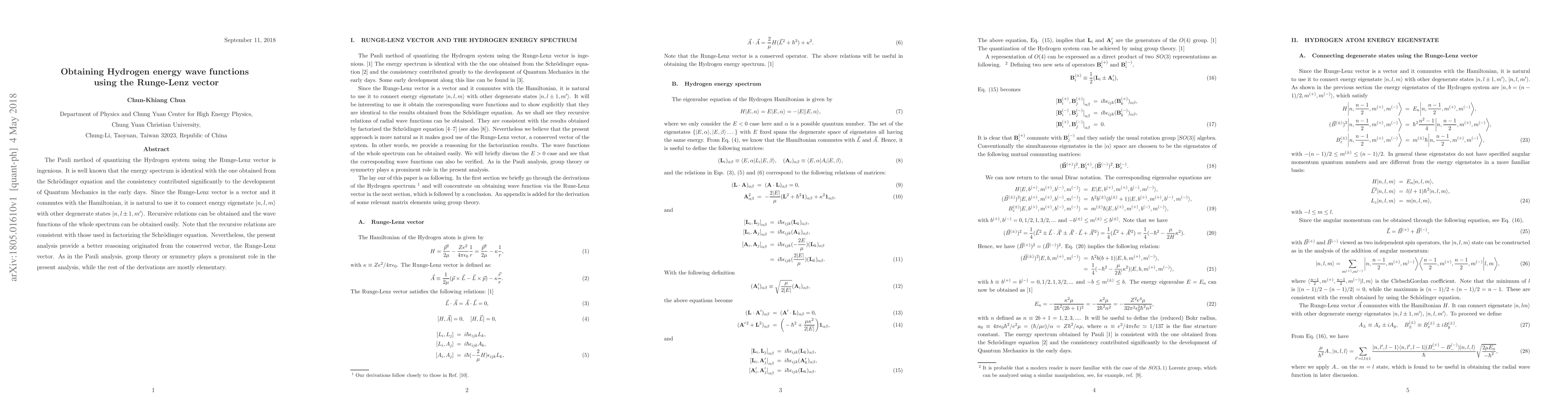 This paper explores the Pauli method for quantizing the Hydrogen atom using the Runge-Lenz vector, demonstrating how recursive relations derived from this conserved vector can yield the entire spectrum of hydrogen energy wave functions. The analysis emphasizes the role of symmetry and group theory in the derivation.