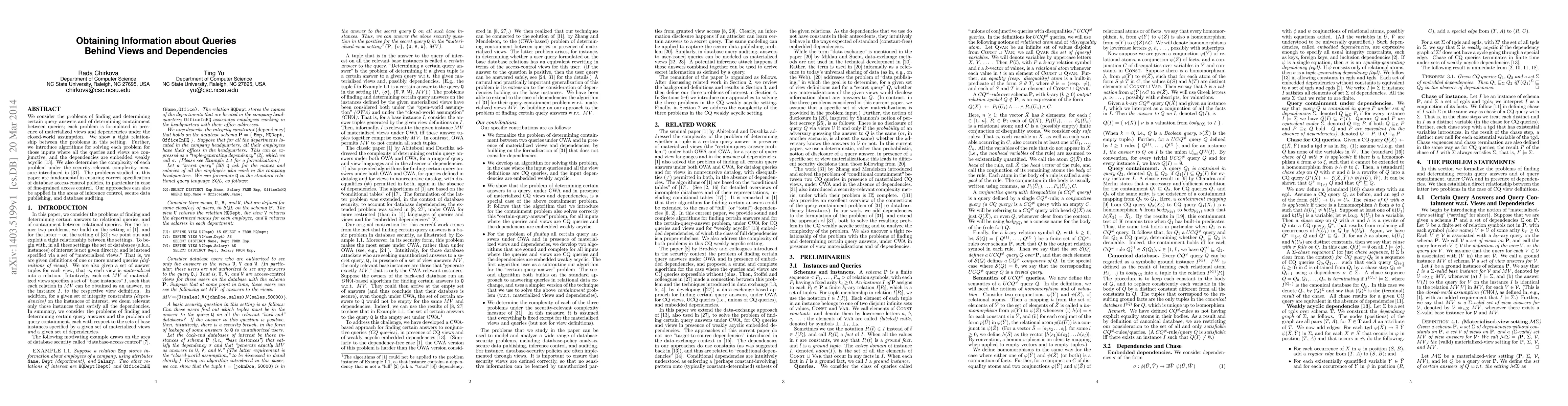 We consider the problems of finding and determining certain query answers and of determining containment between queries; each problem is formulated in presence of materialized views and dependencies under the closed-world assumption. We show a tight relationship between the problems in this setting. Further, we introduce algorithms for solving each problem for those inputs where all the queries and views are conjunctive, and the dependencies are embedded weakly acyclic. We also determine the complexity of each problem under the security-relevant complexity measure introduced by Zhang and Mendelzon in 2005. The problems studied in this paper are fundamental in ensuring correct specification of database access-control policies, in particular in case of fine-grained access control. Our approaches can also be applied in the areas of inference control, secure data publishing, and database auditing.