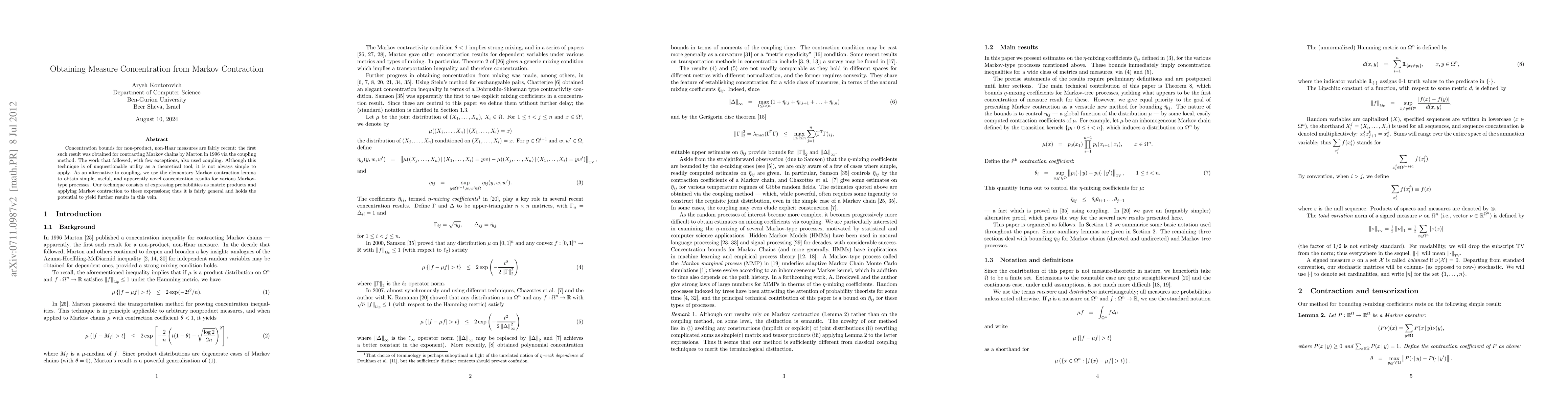 This paper proposes an alternative method using the Markov contraction lemma to derive concentration bounds for non-product, non-Haar measures in Markov-type processes, offering a simpler approach compared to traditional coupling methods. The technique expresses probabilities as matrix products and applies Markov contraction, providing a versatile framework for future research.