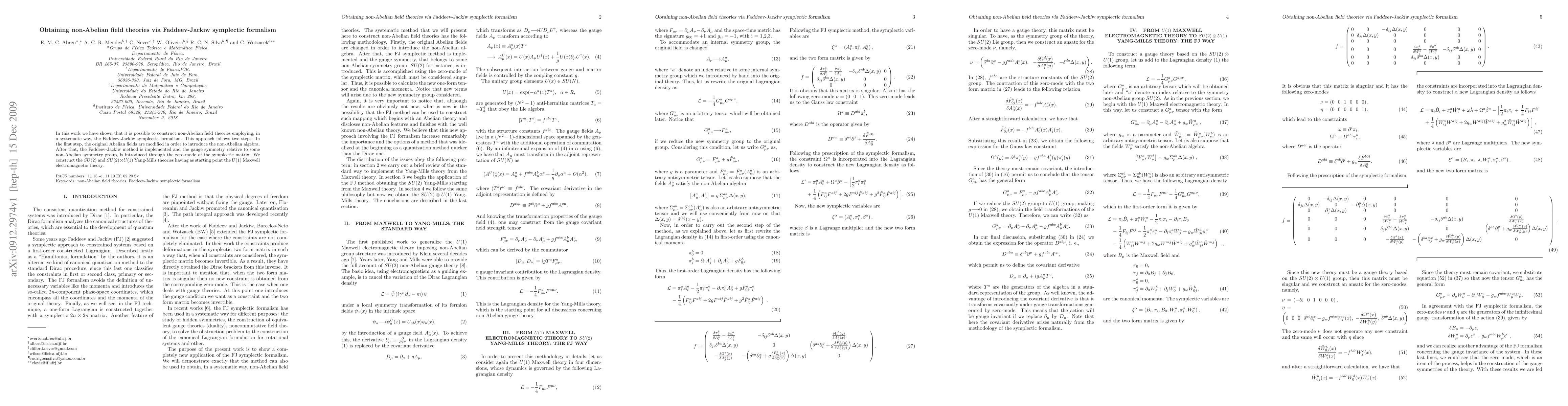 This paper demonstrates a systematic method to construct non-Abelian field theories using the Faddeev-Jackiw symplectic formalism. It modifies Abelian fields to incorporate non-Abelian algebra and introduces gauge symmetry via the zero-mode of the symplectic matrix, constructing SU(2) and SU(2)xU(1) Yang-Mills theories from the U(1) Maxwell theory.