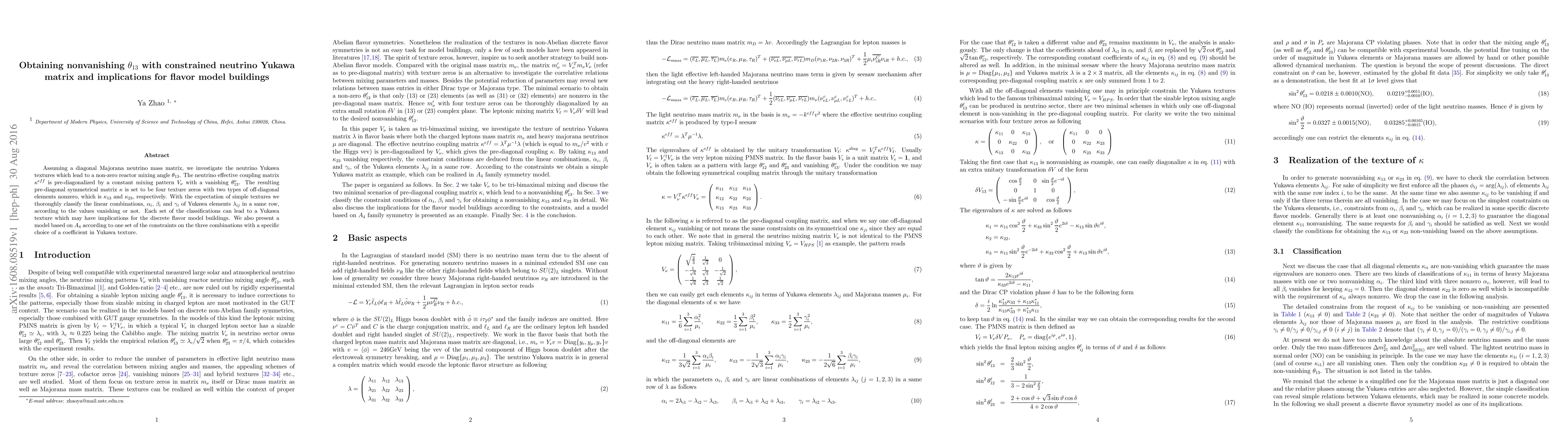 This paper explores neutrino Yukawa textures that yield a non-zero reactor mixing angle $\theta_{13}$ under a constrained diagonal Majorana mass matrix. It classifies linear combinations of Yukawa elements leading to specific textures and presents an $A_{4}$ model based on one such classification.