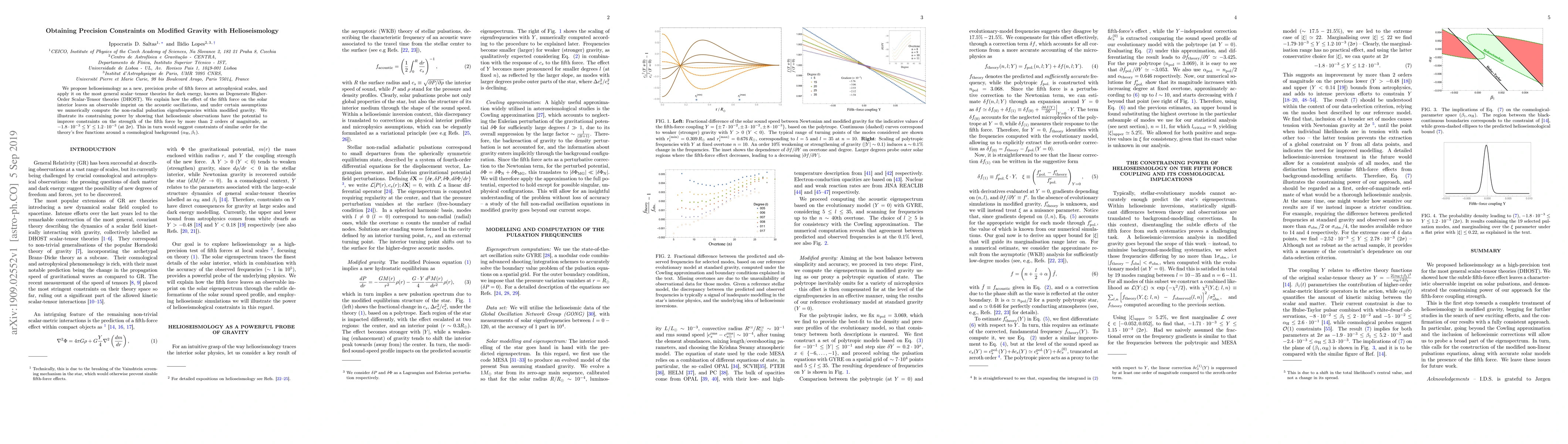 We propose helioseismology as a new, precision probe of fifth forces at astrophysical scales, and apply it on the most general scalar-tensor theories for dark energy, known as Degenerate Higher-Order Scalar-Tensor theories (DHOST). We explain how the effect of the fifth force on the solar interior leaves an observable imprint on the acoustic oscillations, and under certain assumptions we numerically compute the non-radial pulsation eigenfrequencies within modified gravity. We illustrate its constraining power by showing that helioseismic observations have the potential to improve constraints on the strength of the fifth force by more than $2$ orders of magnitude, as $-1.8 \cdot 10^{-3} \leq Y \leq 1.2 \cdot 10^{-3}$ (at $2\sigma$). This in turn would suggest constraints of similar order for the theory's free functions around a cosmological background ($\alpha_{\text{H}}, \beta_{1}$).