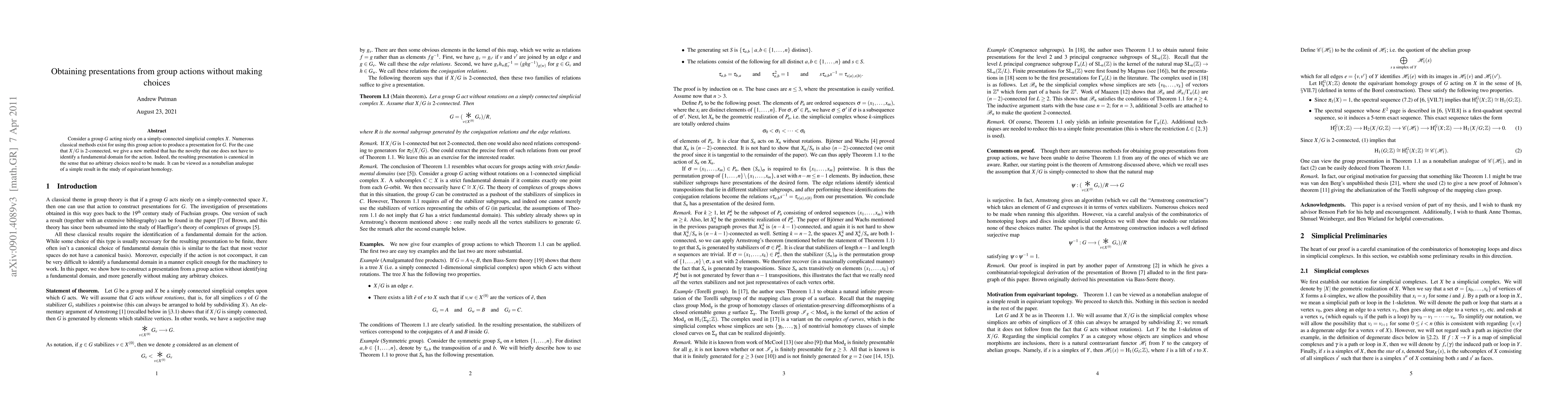 A new method for obtaining presentations from group actions on simply-connected simplicial complexes without identifying a fundamental domain is presented, providing a canonical solution with no arbitrary choices required.