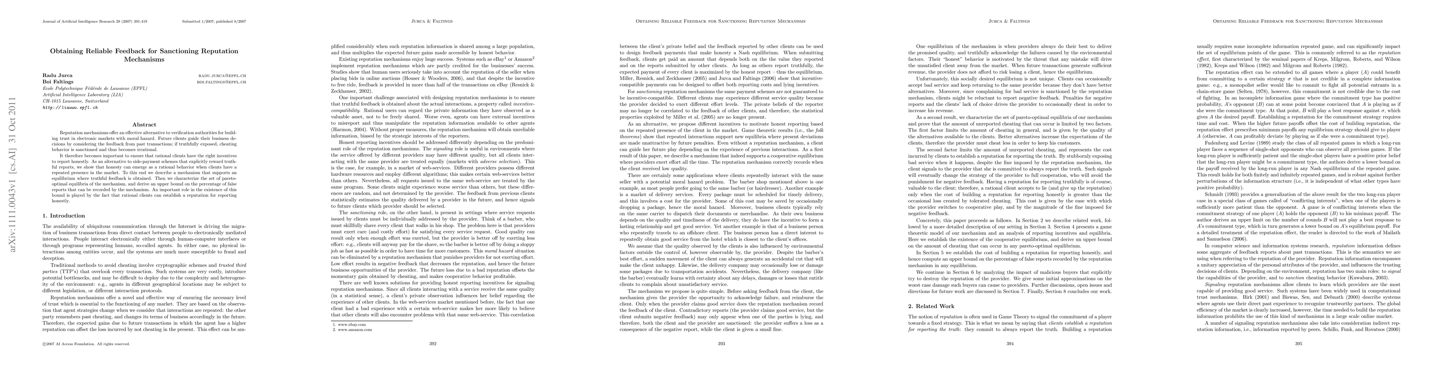 This paper proposes a mechanism for obtaining reliable feedback in reputation systems to sanction cheating behavior in electronic markets. It demonstrates that repeated client presence can incentivize honest reporting without side-payment rewards, characterizing the set of optimal equilibria and establishing an upper bound on false reports.