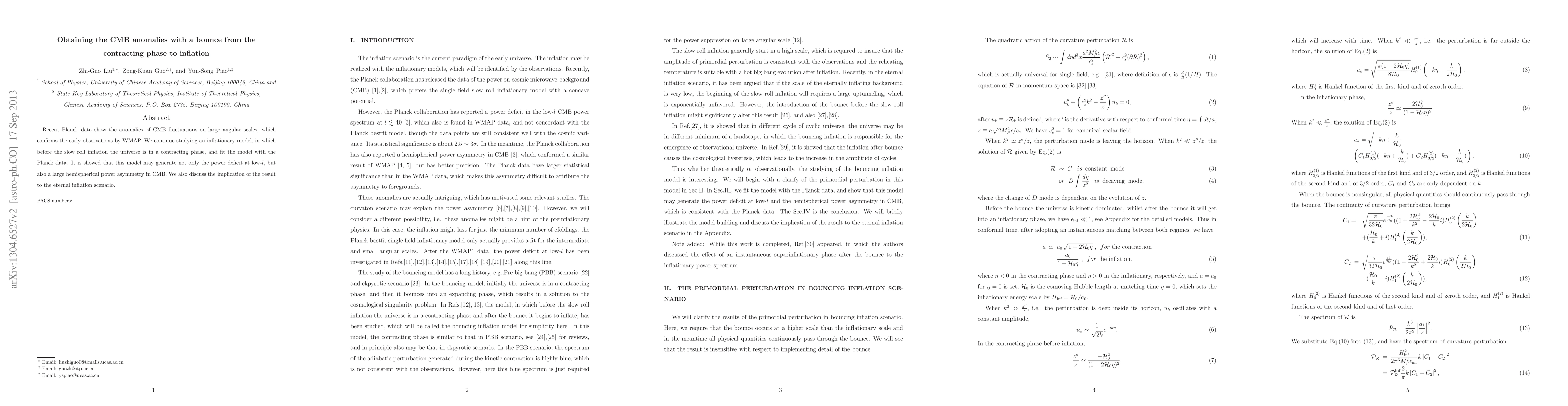 Recent Planck data show the anomalies of CMB fluctuations on large angular scales, which confirms the early observations by WMAP. We continue studying an inflationary model, in which before the slow roll inflation the universe is in a contracting phase, and fit the model with the Planck data. It is showed that this model may generate not only the power deficit at low-l, but also a large hemispherical power asymmetry in CMB. We also discuss the implication of the result to the eternal inflation scenario.