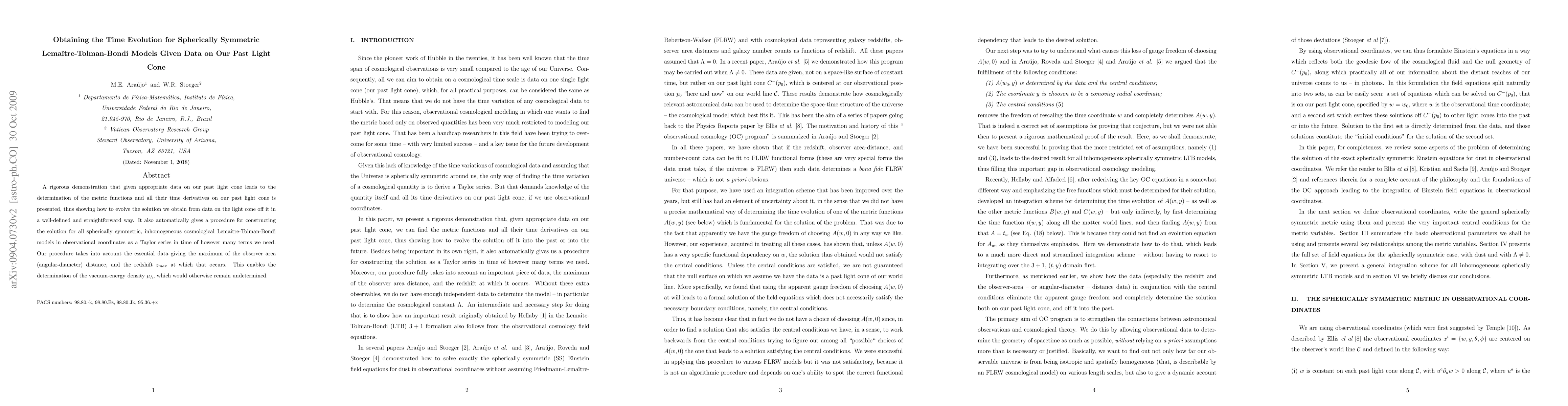 A rigorous demonstration that given appropriate data on our past light cone leads to the determination of the metric functions and all their time derivatives on our past light cone is presented, thus showing how to evolve the solution we obtain from data on the light cone off it in a well-defined and straightforward way. It also automatically gives a procedure for constructing the solution for all spherically symmetric, inhomogeneous cosmological Lema\^itre-Tolman-Bondi models in observational coordinates as a Taylor series in time of however many terms we need. Our procedure takes into account the essential data giving the maximum of the observer area (angular-diameter) distance, and the redshift $z_{max}$ at which that occurs. This enables the determination of the vacuum-energy density $\mu_{\Lambda}$, which would otherwise remain undetermined.