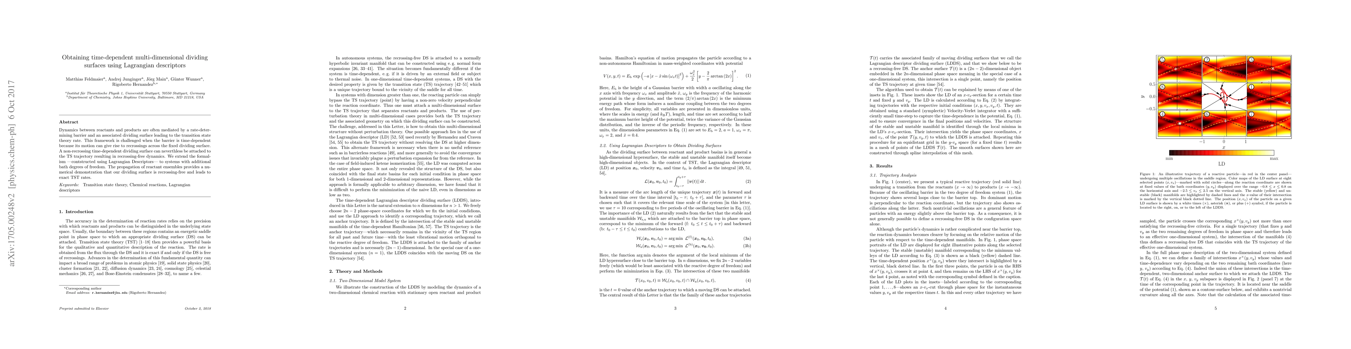 This paper proposes a method to construct time-dependent, multi-dimensional dividing surfaces using Lagrangian descriptors to accurately model reaction dynamics where traditional fixed dividing surfaces fail due to time-dependent barriers. The new approach ensures recrossing-free trajectories and yields exact transition state theory rates.