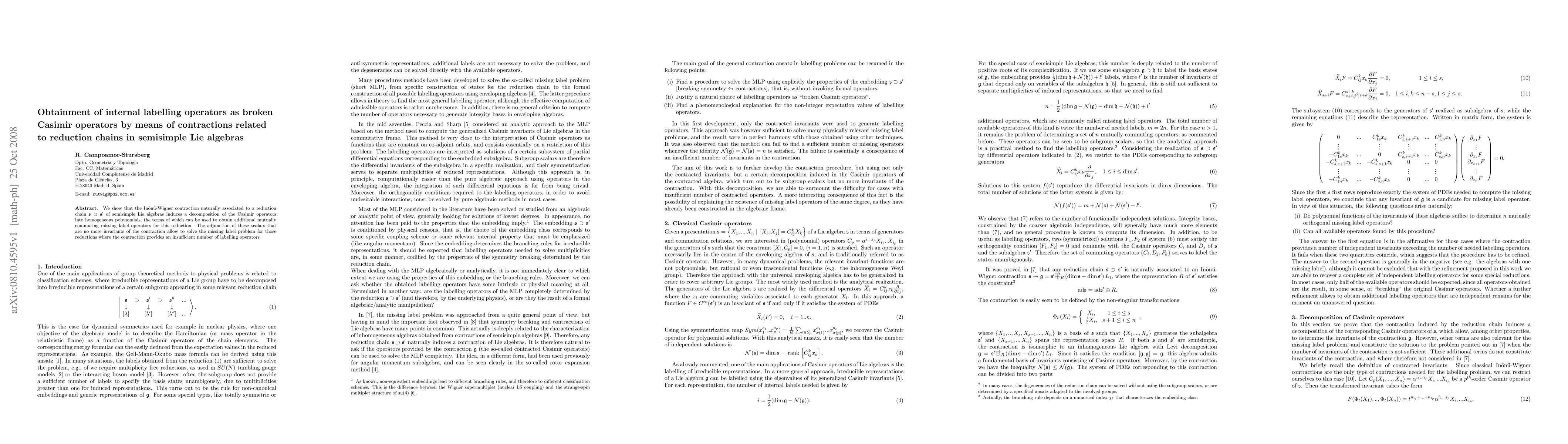 We show that the In\"on\"u-Wigner contraction naturally associated to a reduction chain $\frak{s}\supset \frak{s}^{\prime}$ of semisimple Lie algebras induces a decomposition of the Casimir operators into homogeneous polynomials, the terms of which can be used to obtain additional mutually commuting missing label operators for this reduction. The adjunction of these scalars that are no more invariants of the contraction allow to solve the missing label problem for those reductions where the contraction provides an insufficient number of labelling operators.