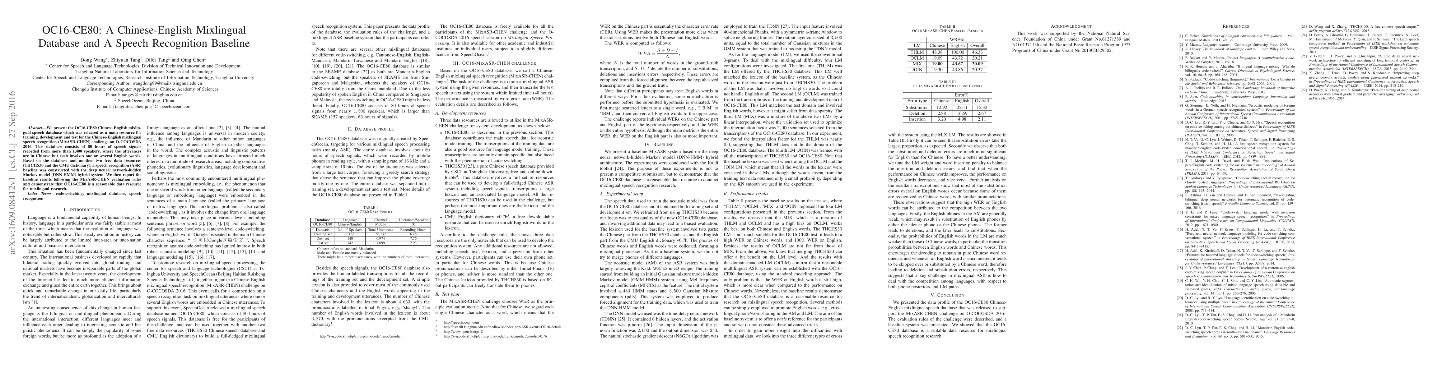 The OC16-CE80 Chinese-English mixlingual speech database, comprising 80 hours of speech from over 1,400 speakers, was developed for the MixASR-CHEN challenge. A speech recognition baseline using a DNN-HMM hybrid system was constructed and evaluated, demonstrating the database's utility for mixlingual speech recognition research.