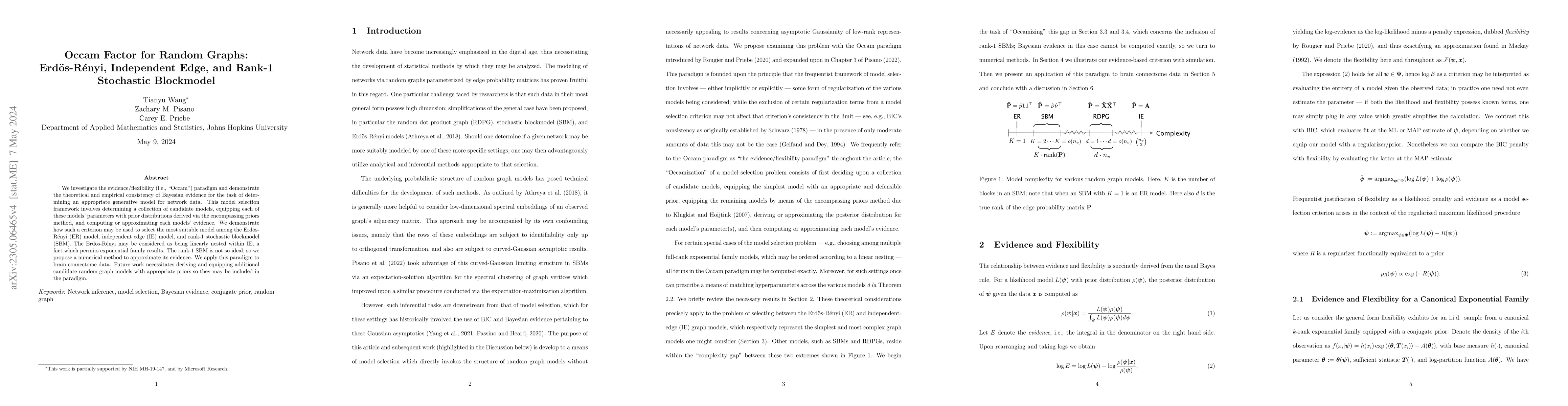 We investigate the evidence/flexibility (i.e., "Occam") paradigm and demonstrate the theoretical and empirical consistency of Bayesian evidence for the task of determining an appropriate generative model for network data. This model selection framework involves determining a collection of candidate models, equipping each of these models' parameters with prior distributions derived via the encompassing priors method, and computing or approximating each models' evidence. We demonstrate how such a criterion may be used to select the most suitable model among the Erd\"{o}s-R\'{e}nyi (ER) model, independent edge (IE) model, and rank-1 stochastic blockmodel (SBM). The Erd\"{o}s-R\'{e}nyi may be considered as being linearly nested within IE, a fact which permits exponential family results. The rank-1 SBM is not so ideal, so we propose a numerical method to approximate its evidence. We apply this paradigm to brain connectome data. Future work necessitates deriving and equipping additional candidate random graph models with appropriate priors so they may be included in the paradigm.