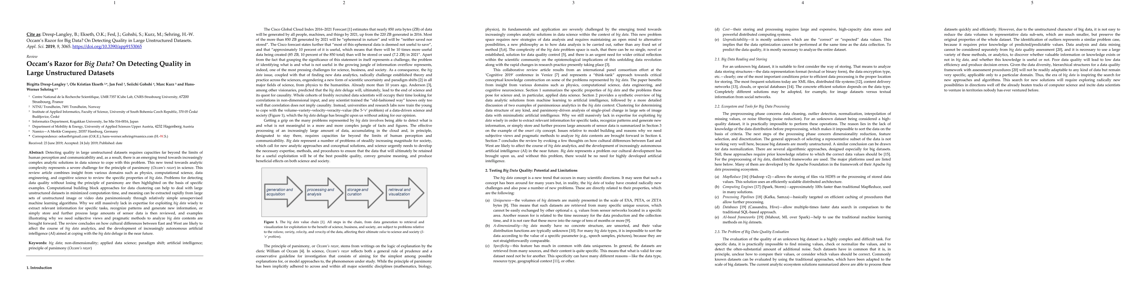 Detecting quality in large unstructured datasets requires capacities far beyond the limits of human perception and communicability and, as a result, there is an emerging trend towards increasingly complex analytic solutions in data science to cope with this problem. This new trend towards analytic complexity represents a severe challenge for the principle of parsimony or Occams Razor in science. This review article combines insight from various domains such as physics, computational science, data engineering, and cognitive science to review the specific properties of big data. Problems for detecting data quality without losing the principle of parsimony are then highlighted on the basis of specific examples. Computational building block approaches for data clustering can help to deal with large unstructured datasets in minimized computation time, and meaning can be extracted rapidly from large sets of unstructured image or video data parsimoniously through relatively simple unsupervised machine learning algorithms. Why we still massively lack in expertise for exploiting big data wisely to extract relevant information for specific tasks, recognize patterns, generate new information, or store and further process large amounts of sensor data is then reviewed; examples illustrating why we need subjective views and pragmatic methods to analyze big data contents are brought forward. The review concludes on how cultural differences between East and West are likely to affect the course of big data analytics, and the development of increasingly autonomous artificial intelligence aimed at coping with the big data deluge in the near future.
