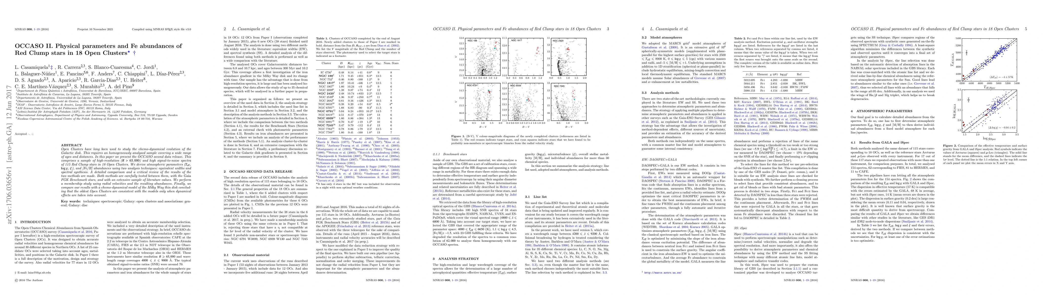 Open Clusters have long been used to study the chemo-dynamical evolution of the Galactic disk. This requires an homogeneously analysed sample covering a wide range of ages and distances. In this aper we present the OCCASO second data release. This comprises a sample of high-resolution ($R>65,000$) and high signal-to-noise spectra of 115 Red Clump stars in 18 Open Clusters. We derive atmospheric parameters ($T_{\mathrm{eff}}$, $\log g$, $\xi$), and [Fe/H] abundances using two analysis techniques: equivalent widths and spectral synthesis. A detailed comparison and a critical review of the results of the two methods are made. Both methods are carefully tested between them, with the \emph{Gaia} FGK Benchmark stars, and with an extensive sample of literature values. We perform a membership study using radial velocities and the resulting abundances. Finally, we compare our results with a chemo-dynamical model of the Milky Way thin disk concluding that the oldest Open Clusters are consistent with the models only when dynamical effects are taken into account.