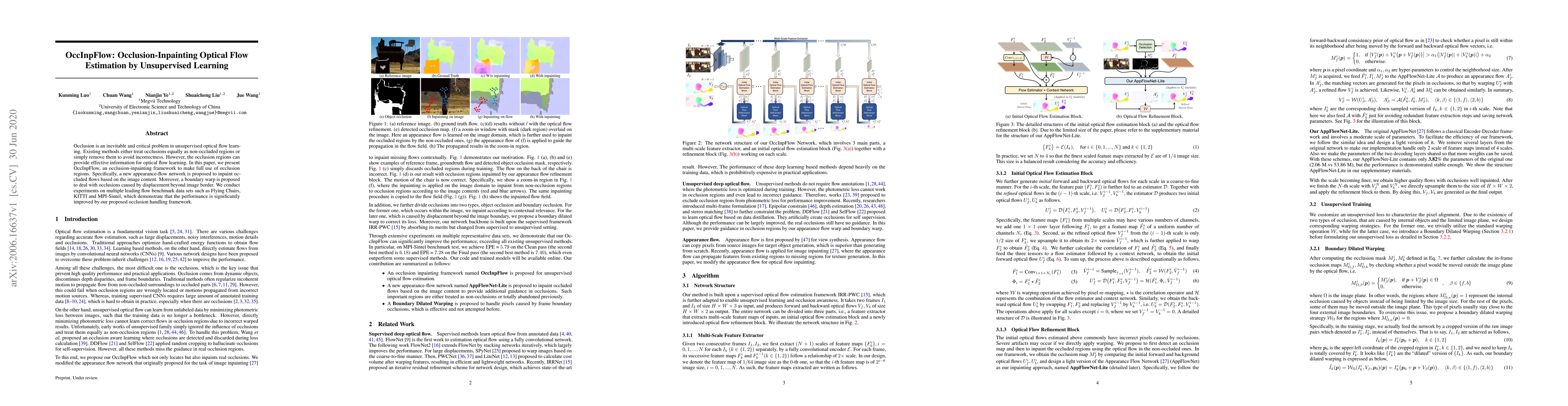 OccInpFlow introduces an occlusion-inpainting framework to leverage occlusion regions for unsupervised optical flow learning. The method employs an appearance-flow network to inpaint occluded regions and a boundary warp to handle border occlusions, significantly improving performance on benchmark datasets.