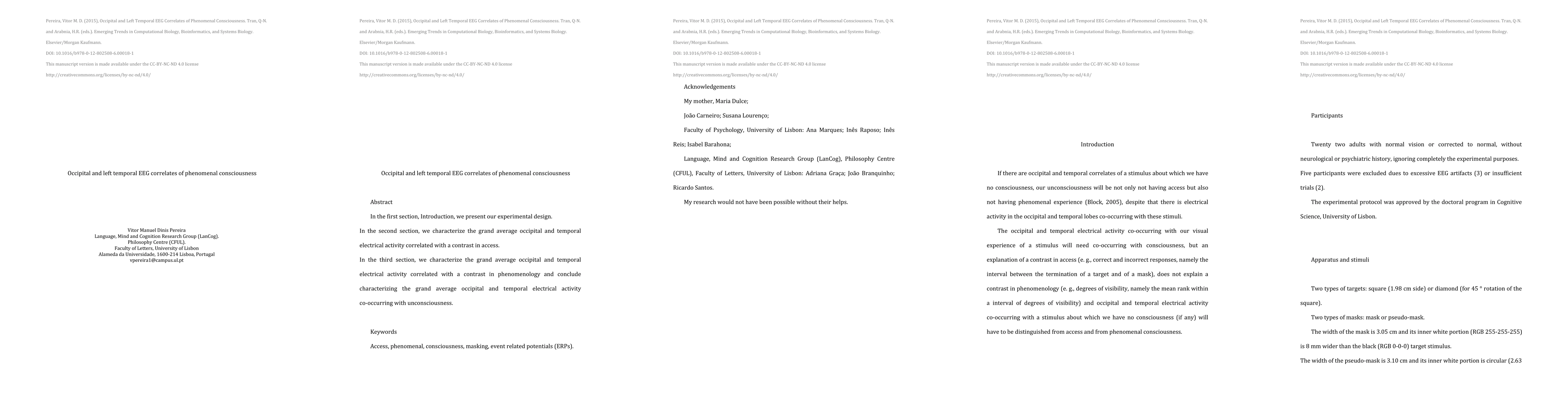 In the first section, Introduction, we present our experimental design. In the second section, we characterize the grand average occipital and temporal electrical activity correlated with a contrast in access. In the third section, we characterize the grand average occipital and temporal electrical activity correlated with a contrast in phenomenology and conclude characterizing the grand average occipital and temporal electrical activity co-occurring with unconsciousness.