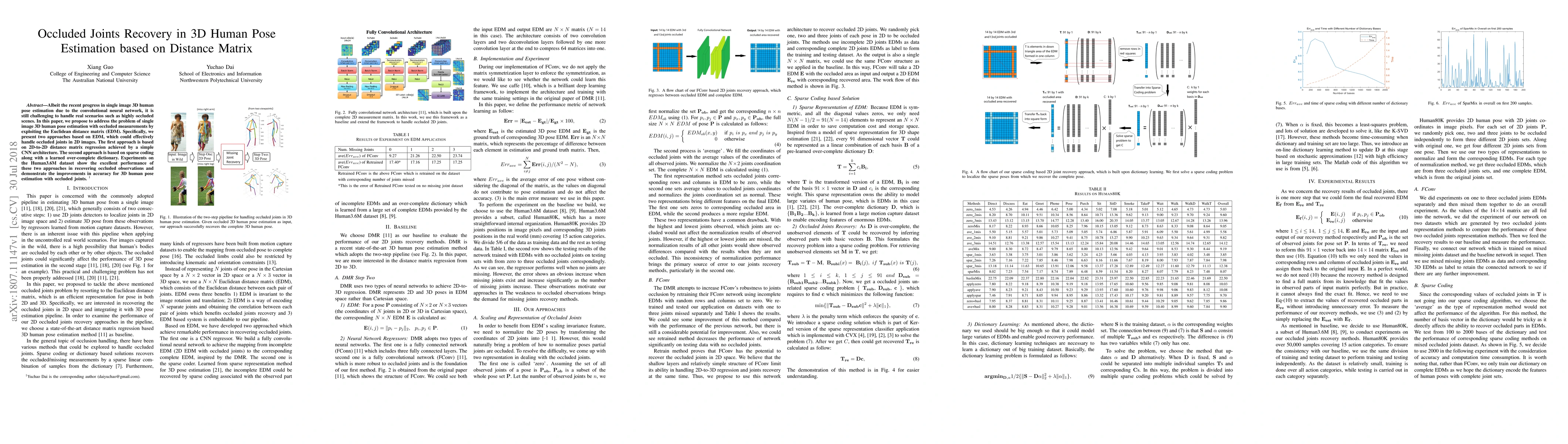 This paper proposes two methods for improving 3D human pose estimation in occluded scenes using the Euclidean distance matrix (EDM). The first method employs a CNN for 2D-to-2D distance matrix regression, while the second uses sparse coding with a learned dictionary. Experiments on the Human3.6M dataset show significant improvements in accuracy for occluded joint recovery.
