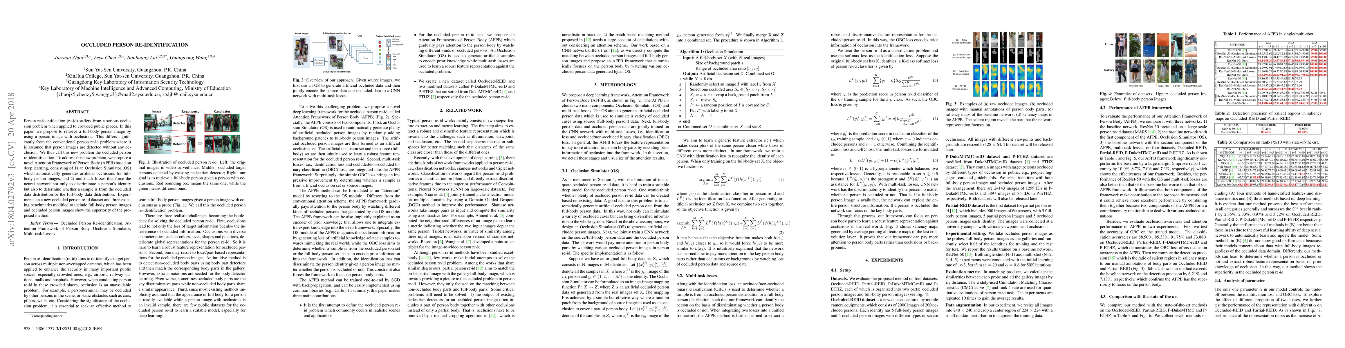 This paper introduces a novel problem of occluded person re-identification, addressing the challenge of identifying individuals in crowded scenes with occlusions. The proposed Attention Framework of Person Body (AFPB) uses an Occlusion Simulator and multi-task losses to distinguish between occluded and full-body images, demonstrating superior performance on new and existing datasets.