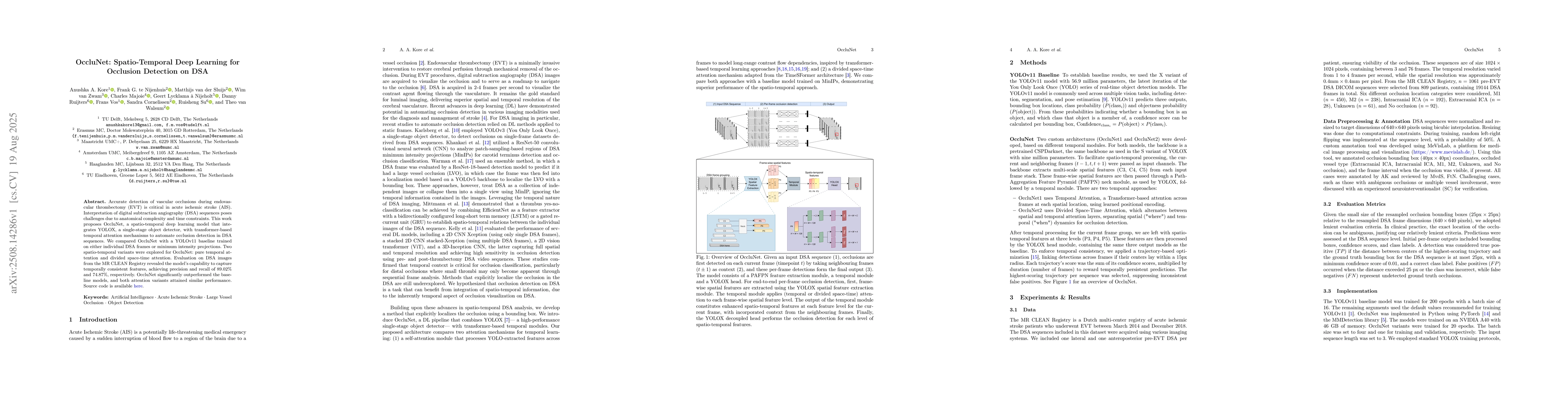 The research introduces OccluNet, a deep learning model that uses YOLOX and transformer-based attention mechanisms to detect vascular occlusions in DSA images for endovascular thrombectomy in acute ischemic stroke patients. OccluNet outperforms baseline models with precision and recall of 89.02% and 74.87%, respectively, demonstrating superior spatio-temporal feature capture in DSA sequences.