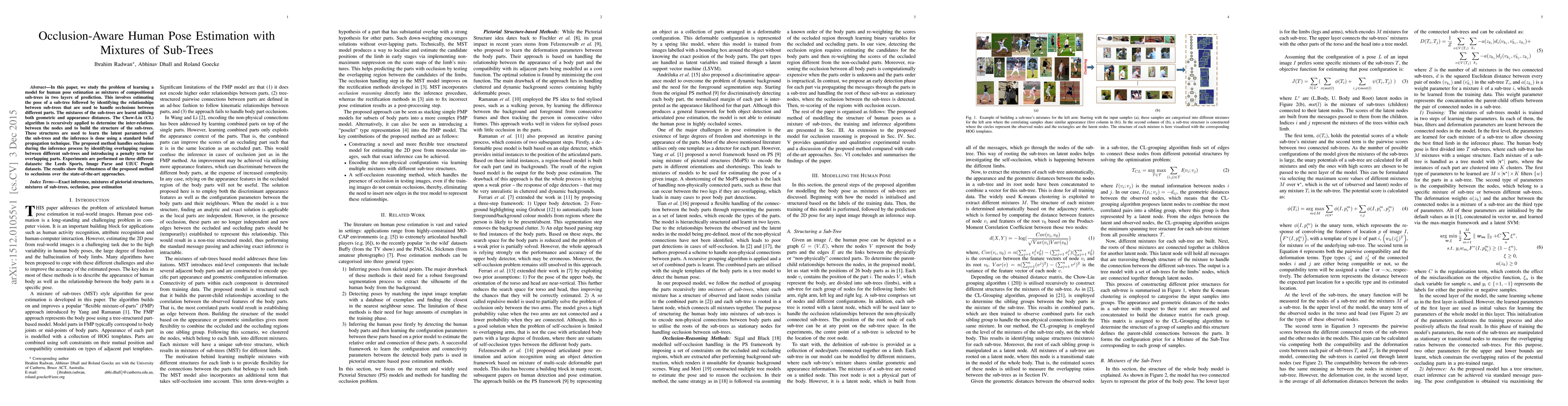 This paper presents a human pose estimation model using mixtures of sub-trees to handle occlusions. It employs geometric and appearance distances to learn sub-tree structures, and the Chow-Liu algorithm for inter-node relations. Occlusions are managed by identifying overlapping regions and adding a penalty term. Experiments on multiple datasets show the method's robustness against occlusions compared to existing approaches.