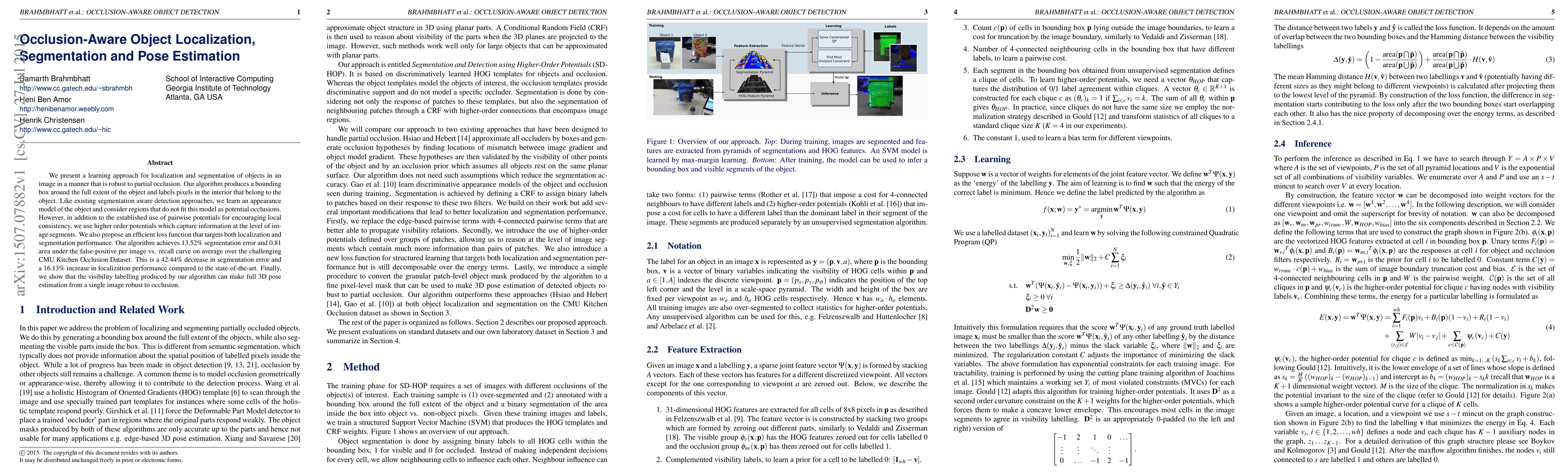 This paper presents a learning approach for robust object localization, segmentation, and pose estimation in images with partial occlusions, using higher-order potentials and an efficient loss function, achieving significant improvements over state-of-the-art methods and enabling robust 3D pose estimation.